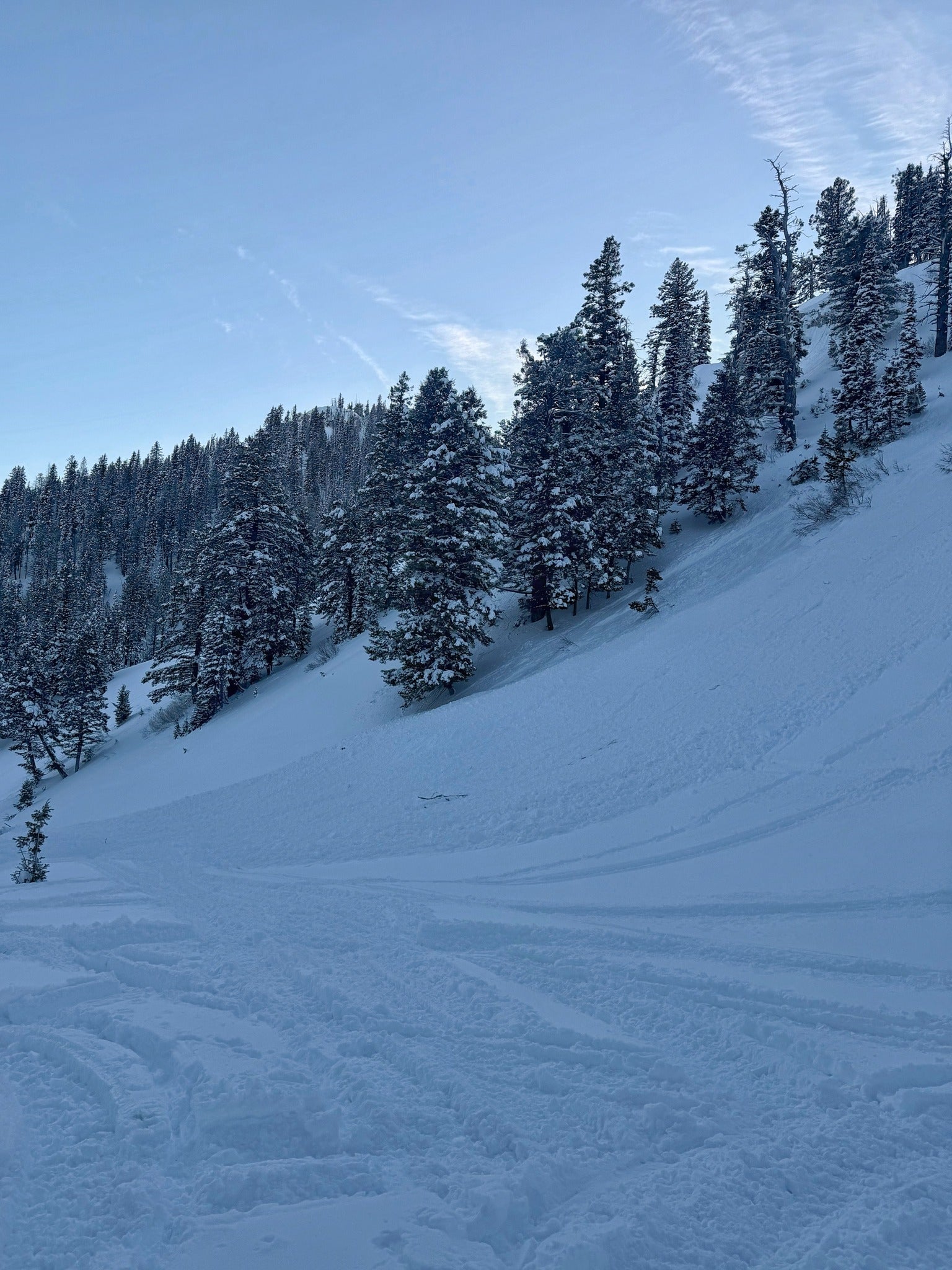 "Slopes steeper than 30 degrees should be avoided, including flatter terrain below steep slopes," says GNFAC.