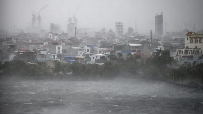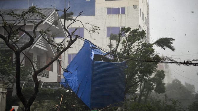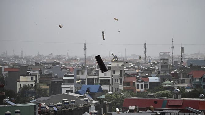 TOPSHOT - Debris flies in the air as heavy rain and high winds from Super Typhoon Yagi impact Hai Phong on September 7, 2024. Super Typhoon Yagi made landfall on northern Vietnam's Hai Phong and Quang Ninh provinces on September 7, bringing wind speeds exceeding 149 kilometres (92 miles) per hour, state media said. (Photo by NHAC NGUYEN / AFP) (Photo by NHAC NGUYEN/AFP via Getty Images)