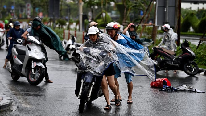 motorcyclists struggle from the strong wind of Typhoon Yagi in Hai Phong city on September 7, 2024. Super Typhoon Yagi threatened September 6 to be the strongest storm in over a decade to hit heavily populated areas of southern China, while tens of thousands of people also prepared to seek shelter in neighbouring Vietnam. (Photo by Nhac NGUYEN / AFP) (Photo by NHAC NGUYEN/AFP via Getty Images)