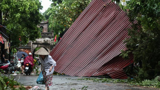 A woman walks past fallen trees and debris on a street after Super Typhoon Yagi hit Hanoi, on September 8, 2024. Super Typhoon Yagi uproots thousands of trees, sweeps ships and boats out to sea and rips roofs off houses in northern Vietnam, after leaving a trail of destruction in southern China and the Philippines. (Photo by AFP) (Photo by STR/AFP via Getty Images)