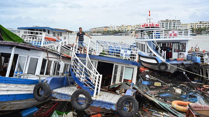 TOPSHOT - A man checks his damaged boat after Super Typhoon Yagi hit Ha Long bay, in Quang Ninh province, on September 8, 2024. Super Typhoon Yagi uproots thousands of trees, sweeps ships and boats out to sea and rips roofs off houses in northern Vietnam, after leaving a trail of destruction in southern China and the Philippines. (Photo by Nhac NGUYEN / AFP) (Photo by NHAC NGUYEN/AFP via Getty Images)