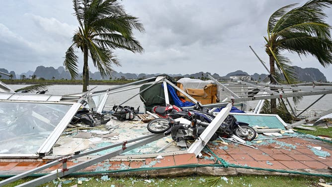 TOPSHOT - This picture shows swept motorbikes with the debris of destroyed waiting lounges on the shore after Super Typhoon Yagi hit Ha Long bay, in Quang Ninh province, on September 8, 2024. Super Typhoon Yagi uproots thousands of trees, sweeps ships and boats out to sea and rips roofs off houses in northern Vietnam, after leaving a trail of destruction in southern China and the Philippines. (Photo by Nhac NGUYEN / AFP) (Photo by NHAC NGUYEN/AFP via Getty Images)