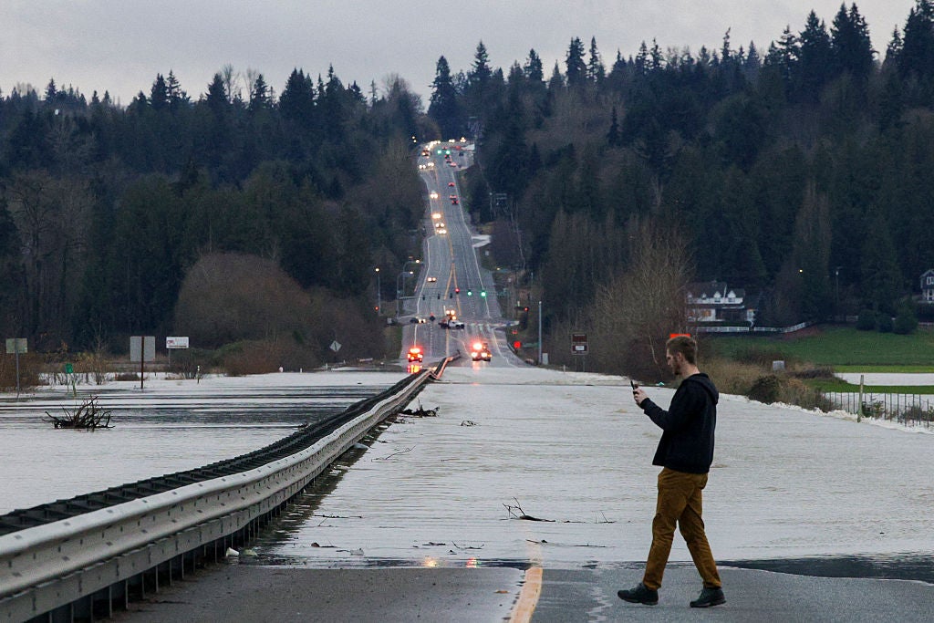 A person stops to capture cellphone images as flood waters from the Snohomish River cover a portion of State Route 9 in Snohomish, Washington, on December 11, 2025. Tens of thousands of people were under evacuation orders Thursday in western North America, after days of heavy rain forced rivers to burst their banks. Storms have battered Washington state in the US and British Columbia over the Canadian border for several days, with rivers continuing to rise.