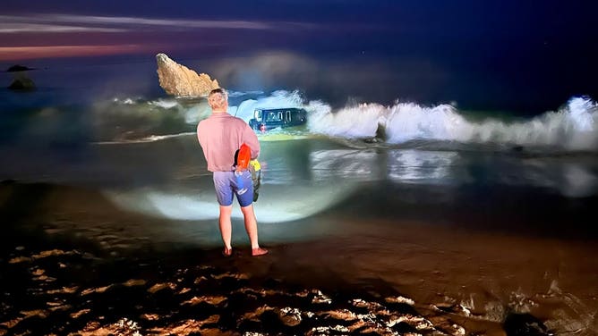 NEWPORT, Calif. – A Jeep was nearly overtaken by the waves in Southern California over the weekend, prompting an ocean rescue in challenging conditions.
