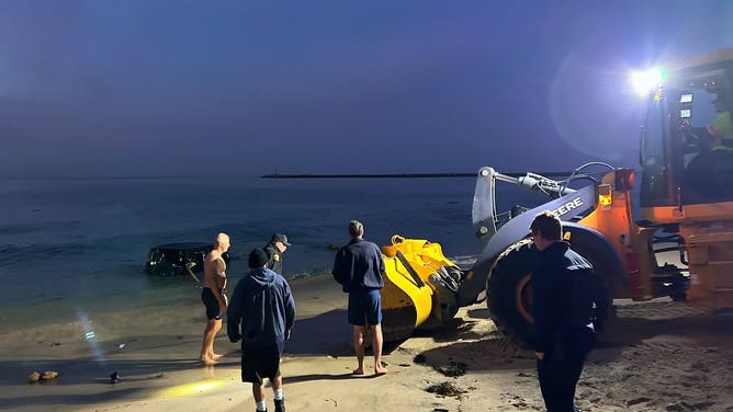 The vehicle was nearly pulled into the Pacific Ocean along the Corona Del Mar Main Beach. One person was rescued and taken to a local hospital.