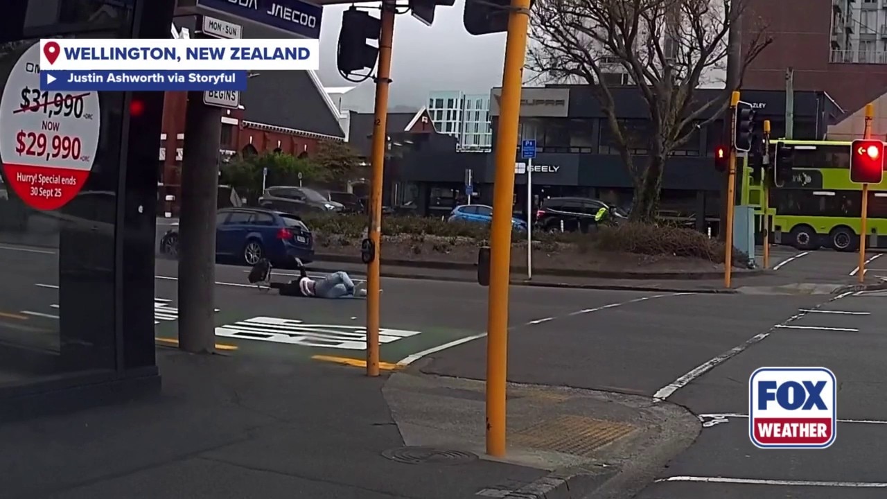 Watch: Woman shoved into oncoming traffic by powerful wind gust in New Zealand