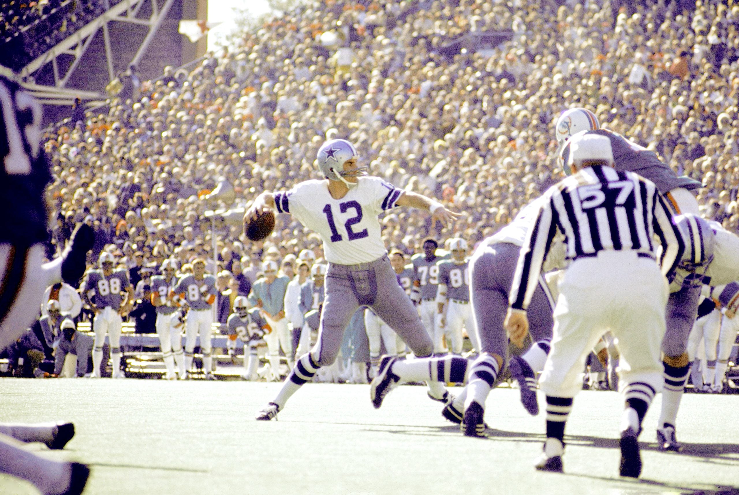 Football: Super Bowl VI: Dallas Cowboys QB Roger Staubach (12) in action, pass vs Miami Dolphins at Tulane Stadium.New Orleans, LA 1/16/1972CREDIT: Walter Iooss, Jr.