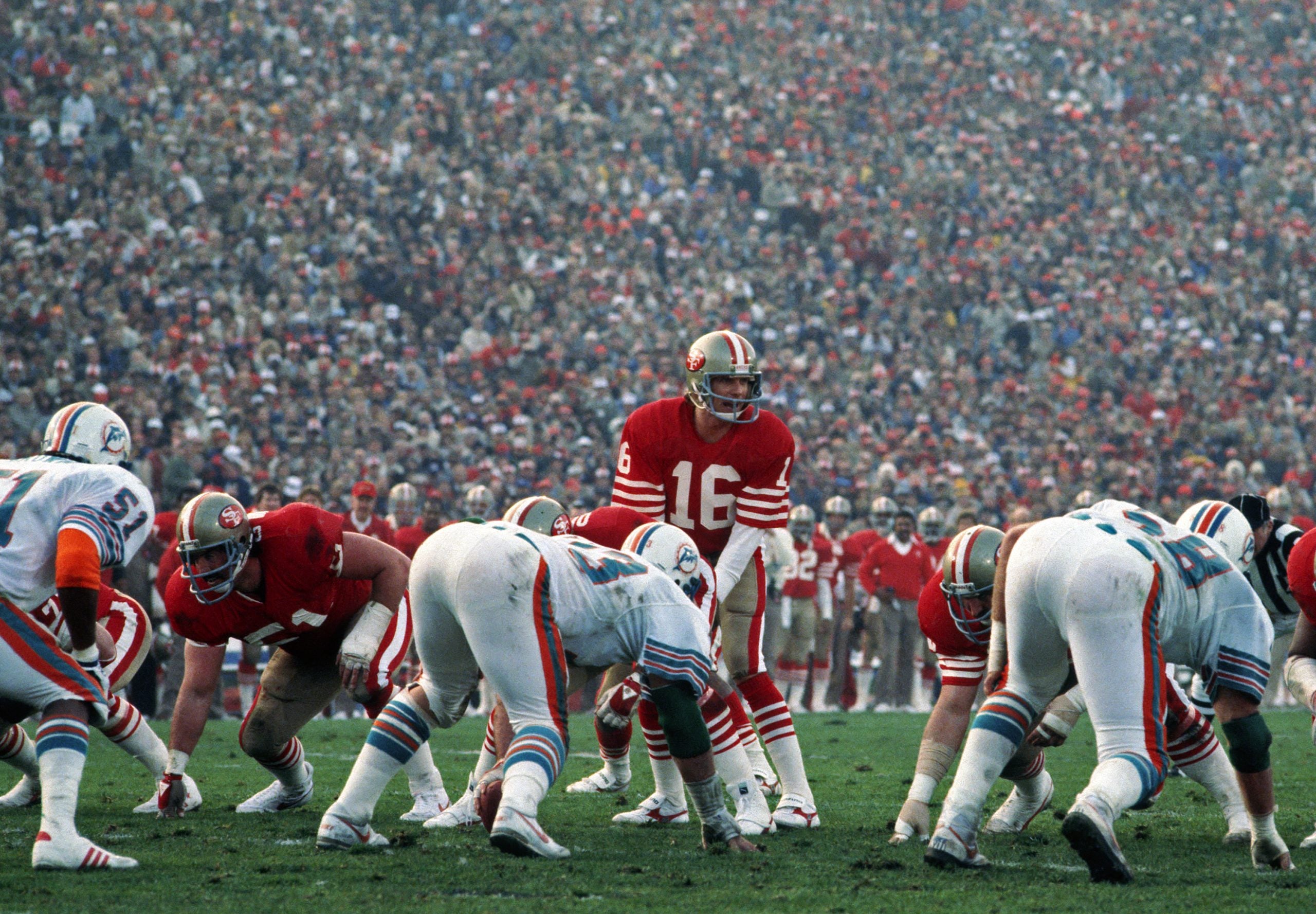 STANFORD, CA - JANUARY 20: Quarterback Joe Montana #16 of the San Francisco 49ers stands behind center Fred Quillan as offensive lineman Randy Cross #51 looks on and as linebacker Mark Brown #51 and defensive linemen Bob Baumhower #73 and Kim Bokamper #58 of the Miami Dolphins are set to pursue the play during Super Bowl XIX at Stanford Stadium on January 20, 1985 in Stanford, California. The 49ers defeated the Dolphins 38-16.
