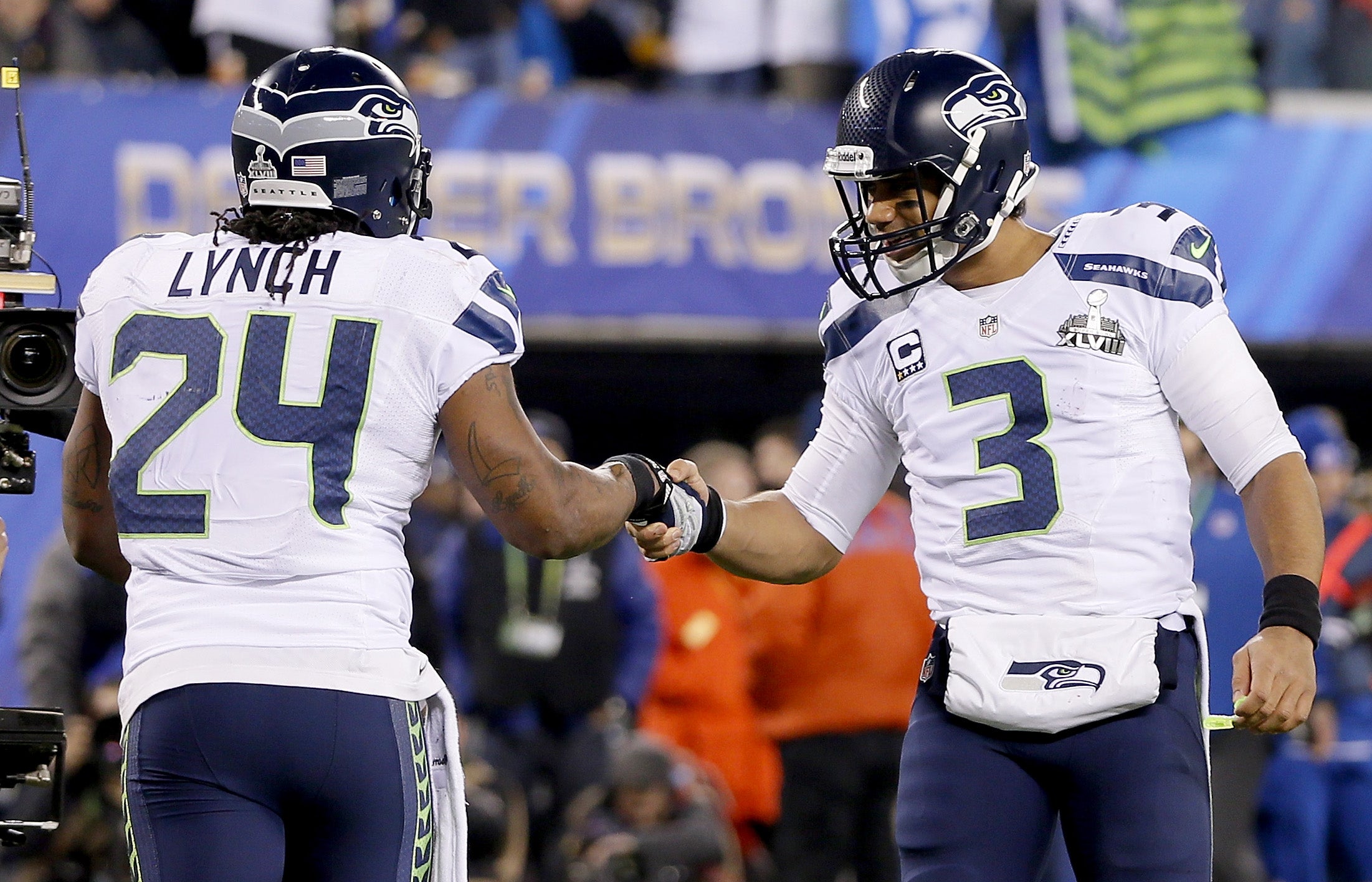 EAST RUTHERFORD, NJ - FEBRUARY 02: Running back Marshawn Lynch #24 of the Seattle Seahawks celebrates his 1-yard touchdown with teammate quarterback Russell Wilson #3 in the second quarter against the Denver Broncos during Super Bowl XLVIII at MetLife Stadium on February 2, 2014 in East Rutherford, New Jersey.