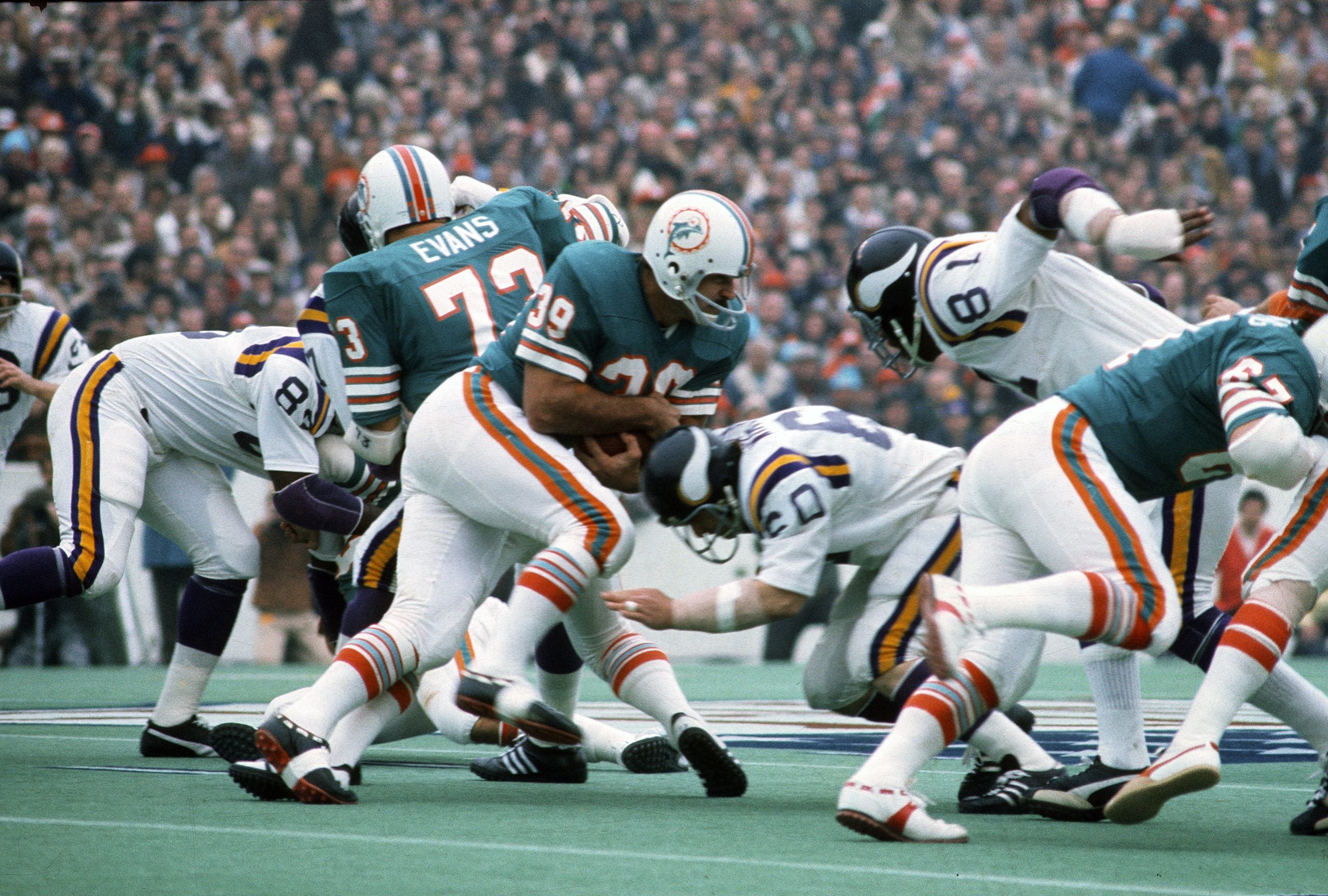 HOUSTON, TX - JANUARY 13: Larry Csonka #39 of the Miami Dolphins carries the ball and gets hit by Roy Winston #60 of the Minnesota Vikings during Super Bowl VIII at Rice Stadium January 13, 1974 in Houston, Texas. The Dolphins won the Super Bowl 24-7.