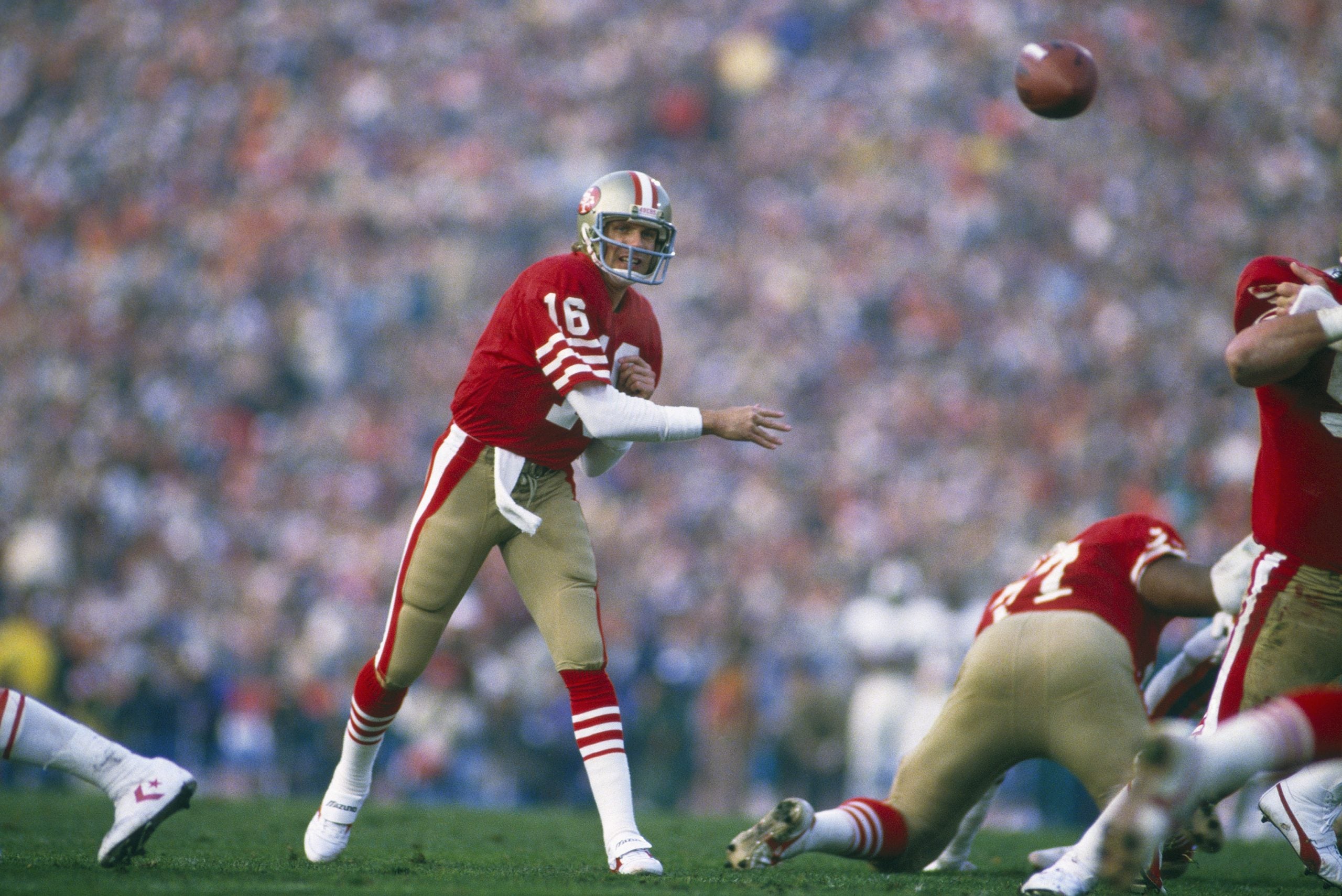 STANFORD, CA - JANUARY 20: San Francisco 49ers quarterback Joe Montana #16 passes against the Miami Dolphins during Super Bowl XIX at Stanford Stadium on January 20, 1985 in Stanford, California. The 49ers defeated the Dolphins 38-16.