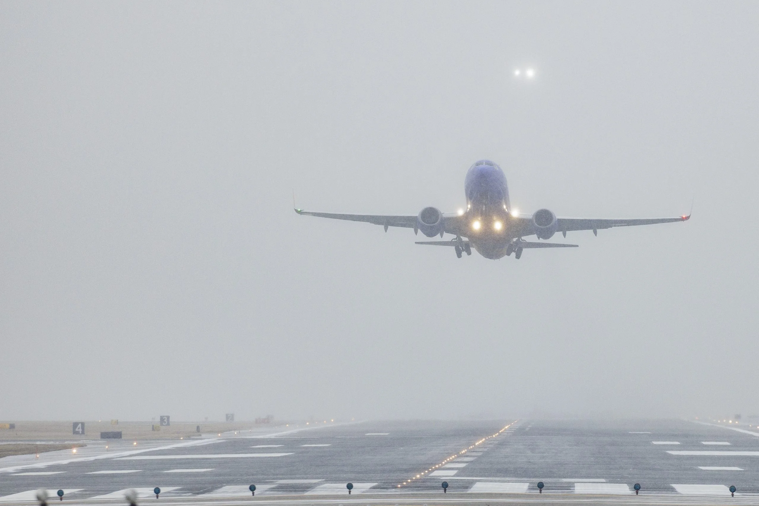 A Southwest plane takes off as snow begins to fall at Ronald Reagan National Airport (DCA) in Arlington, Virginia, U.S., on Sunday, Jan. 16, 2022.