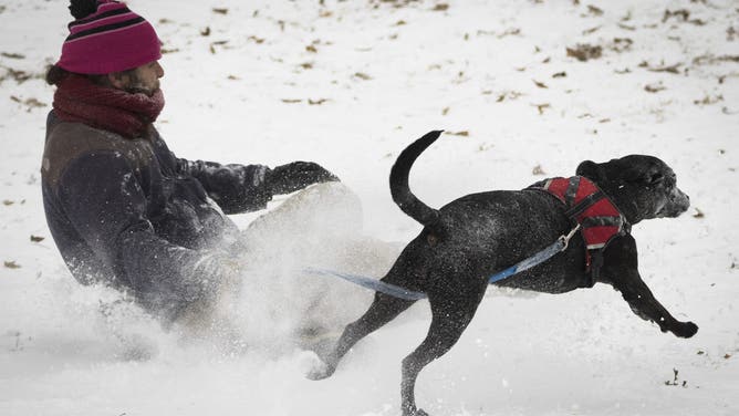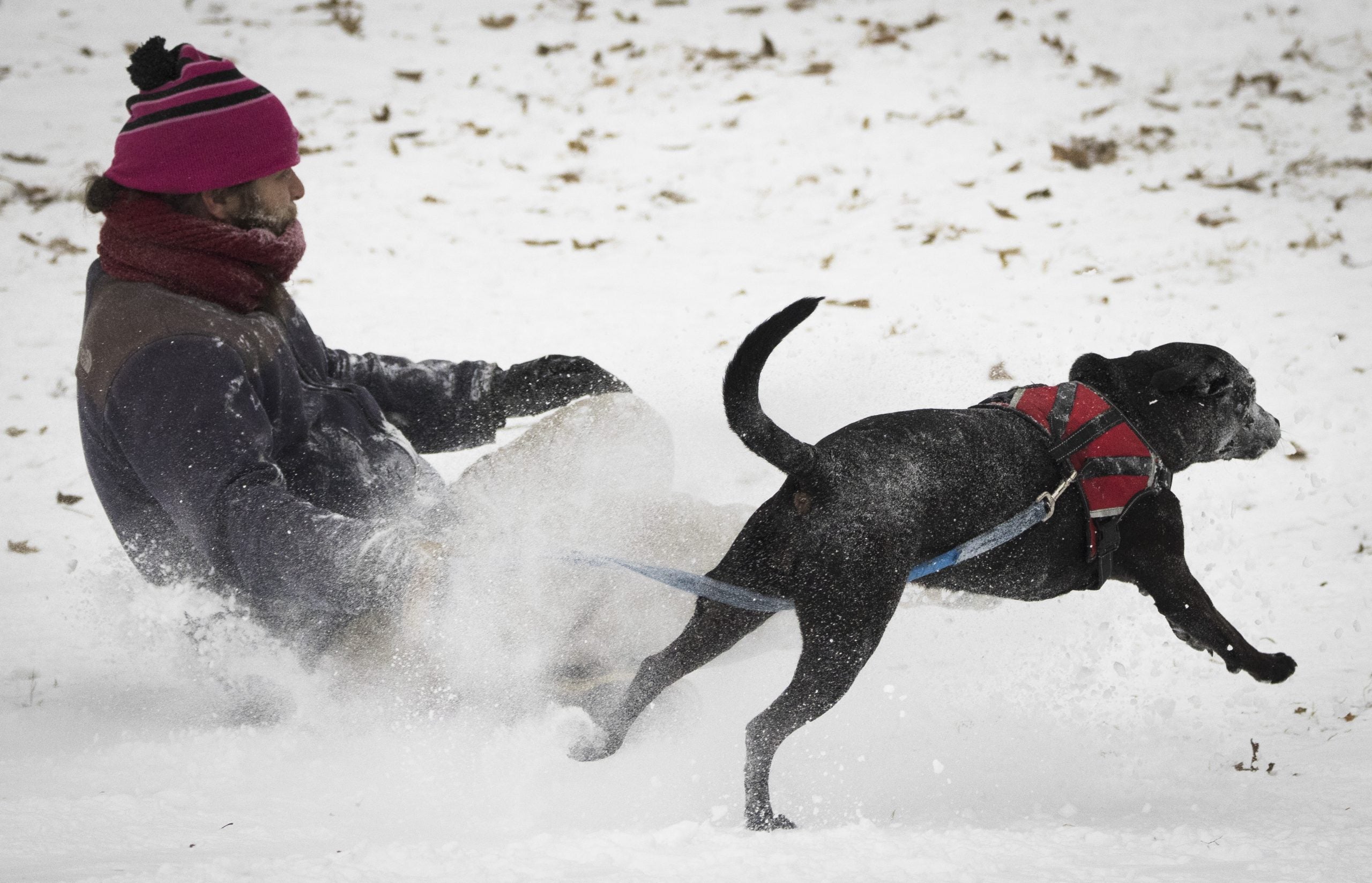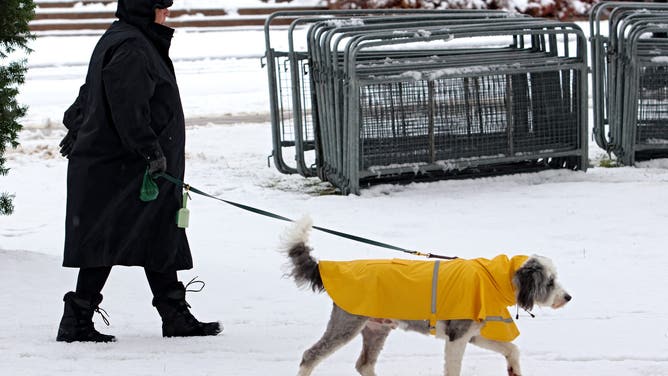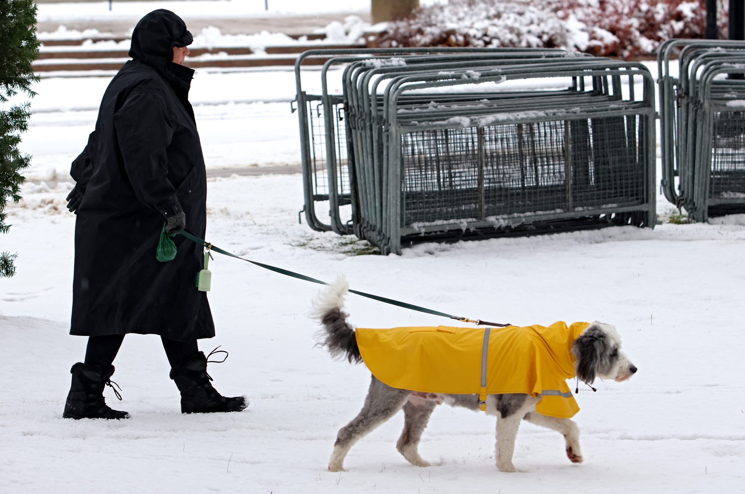 A person walks a dog at Gage Park after a morning snowfall in Brampton, Ontario, on November 30, 2025.