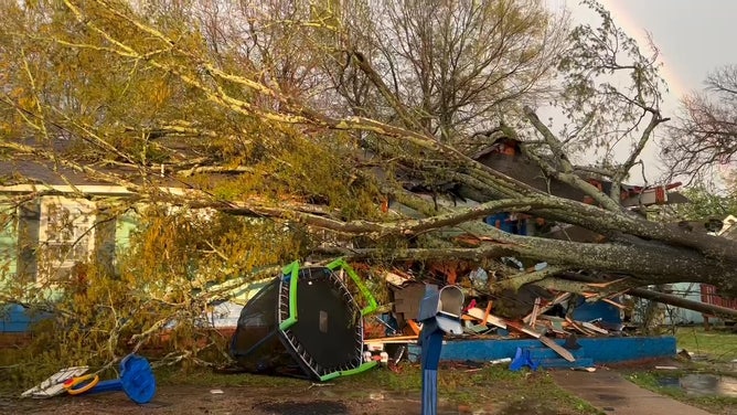 FILE - A man looks at a tree that crashed into a house at 412 Manti Drive when a tornado-like wind roared through his neighborhood.
