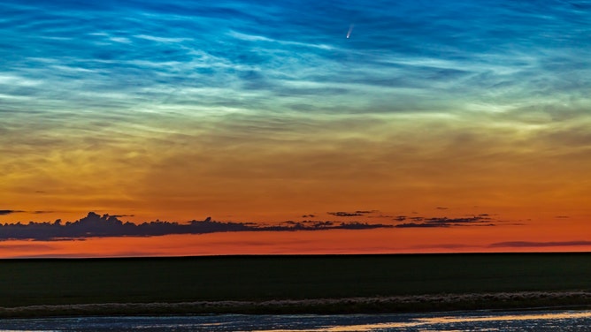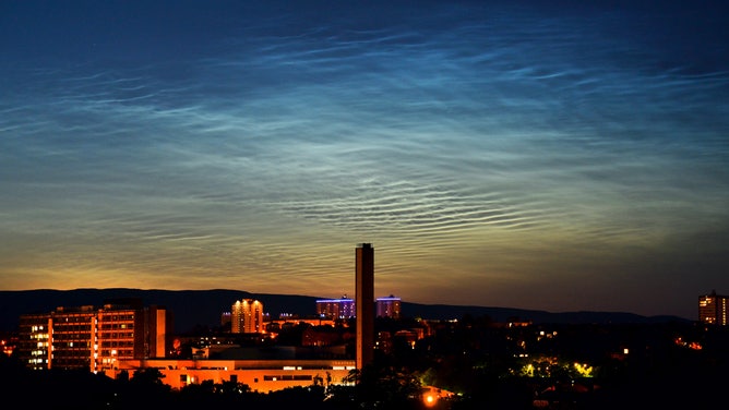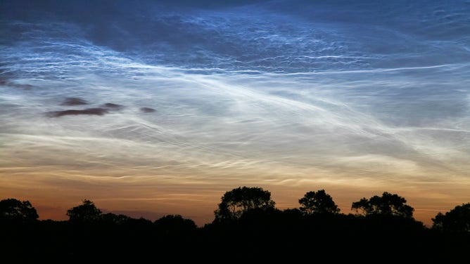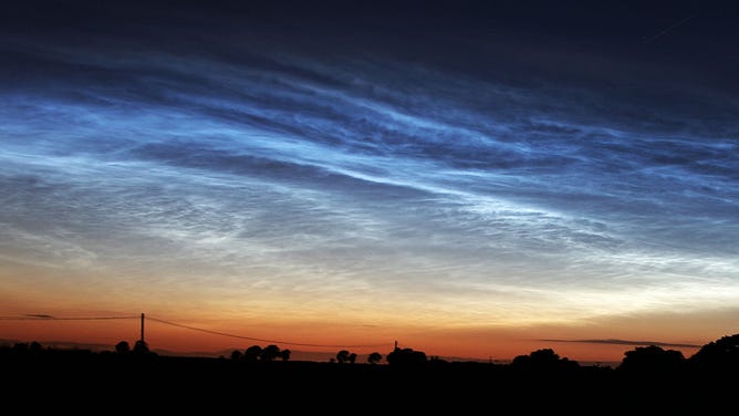 These "Polar Mesospheric Clouds" — informally known as noctilucent clouds, or "night-shining" clouds, glow with a beautiful blue hue as the sun sits just below the horizon. But they are not the typical ones that portend rain; instead, they are in the highest reaches of the atmosphere.