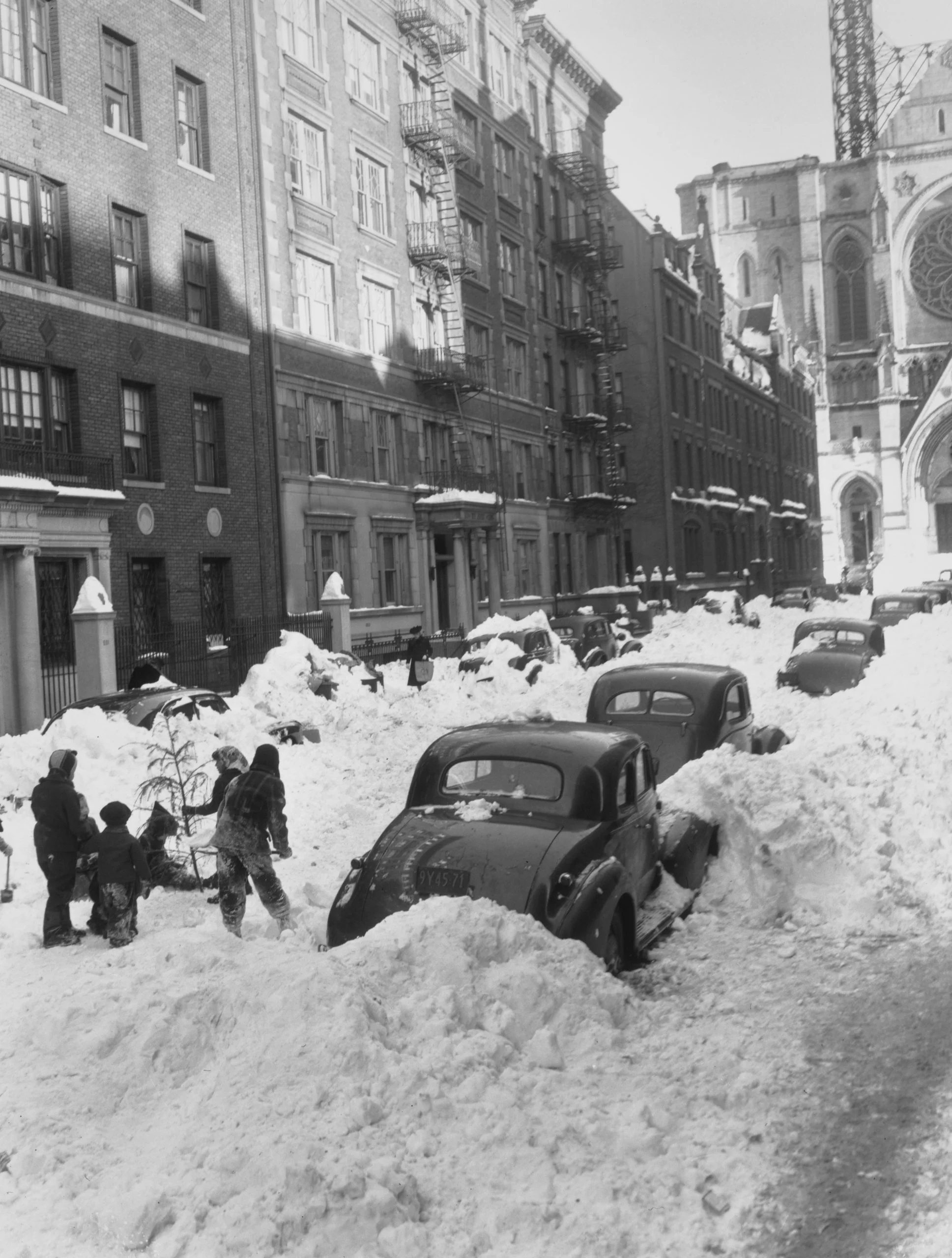People clearing snow following a snowstorm in New York City, New York, 29th December 1947. The North American blizzard of 1947 brought the northeast of the United States to a standstill, with over 26 inches falling on New York City.