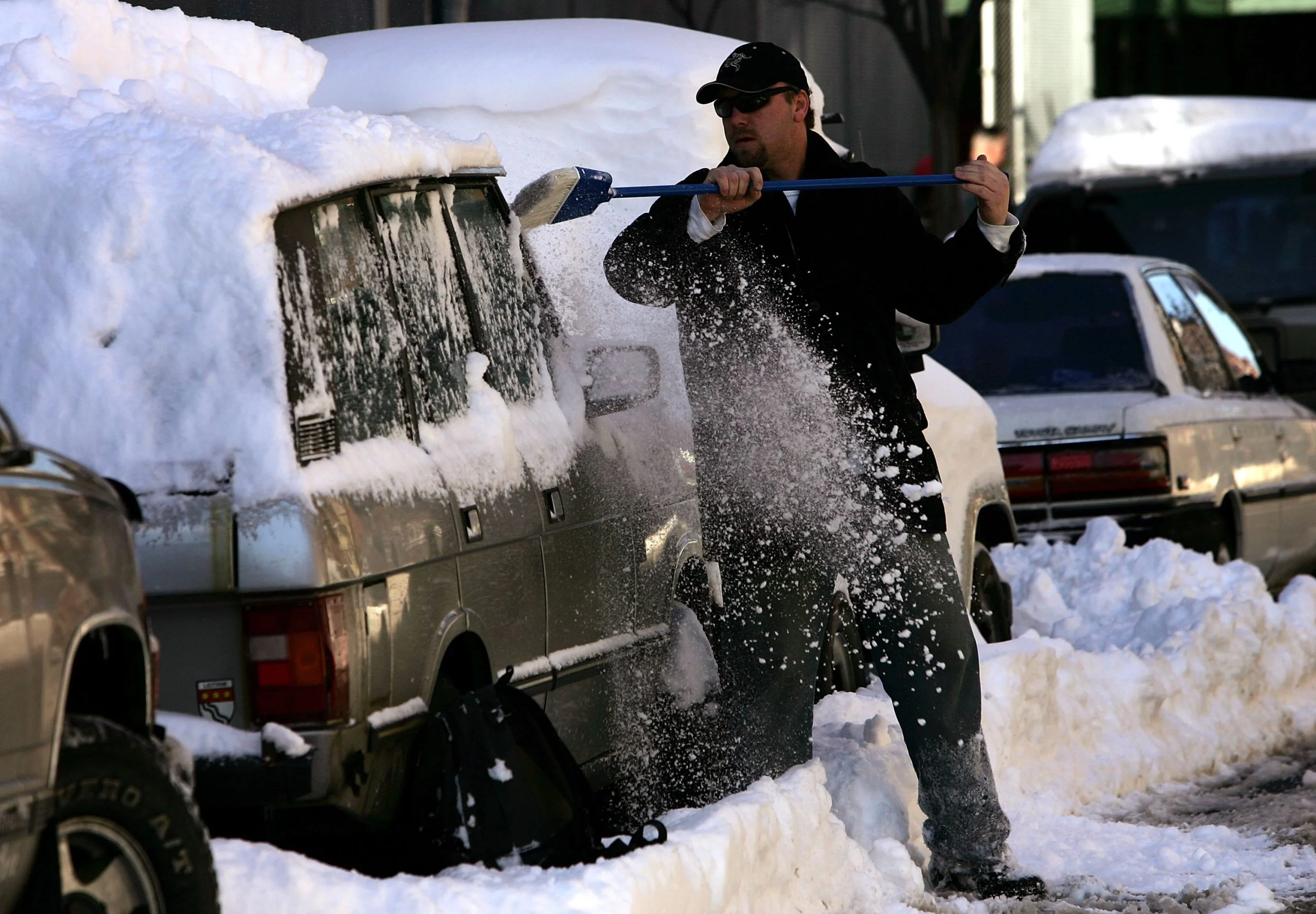 NEW YORK - FEBRUARY 13: A man clears snow from his vehicle the morning after a Northeast storm dropped more than two-feet of snow February 13, 2006 in New York City. The storm hit New York City on the night of February 11, 2006 resulting in blizzard conditions and setting a new snowfall record. The storm shut down airports in the Northeast and caused power outages.