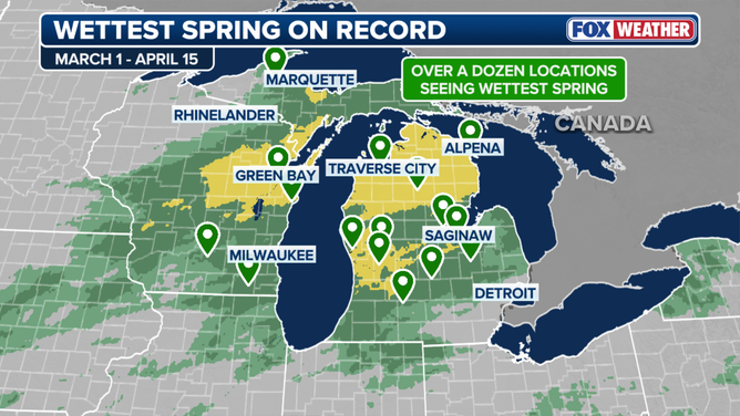 More than a dozen locations in Wisconsin and Michigan are recording their wettest springs ever.