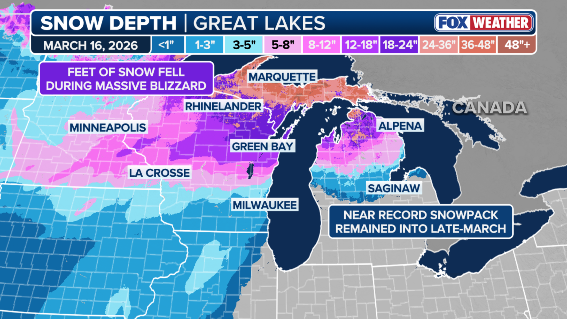 A blizzard from March 14 to 16 brought feet of snow to the region, increasing snowpack significantly, especially in places like Green Bay, Wisconsin, and Michigan's Upper Peninsula.