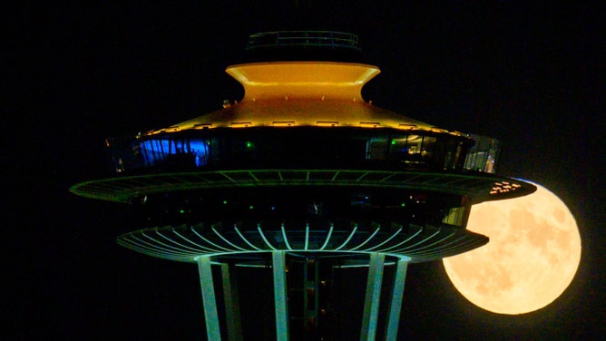 The Full Buck Supermoon sits alongside the Space Needle in Seattle on July 13, 2022.