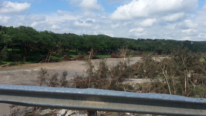 The Blanco River at Wimberley, Texas rose to more than 40 feet in a few hours.