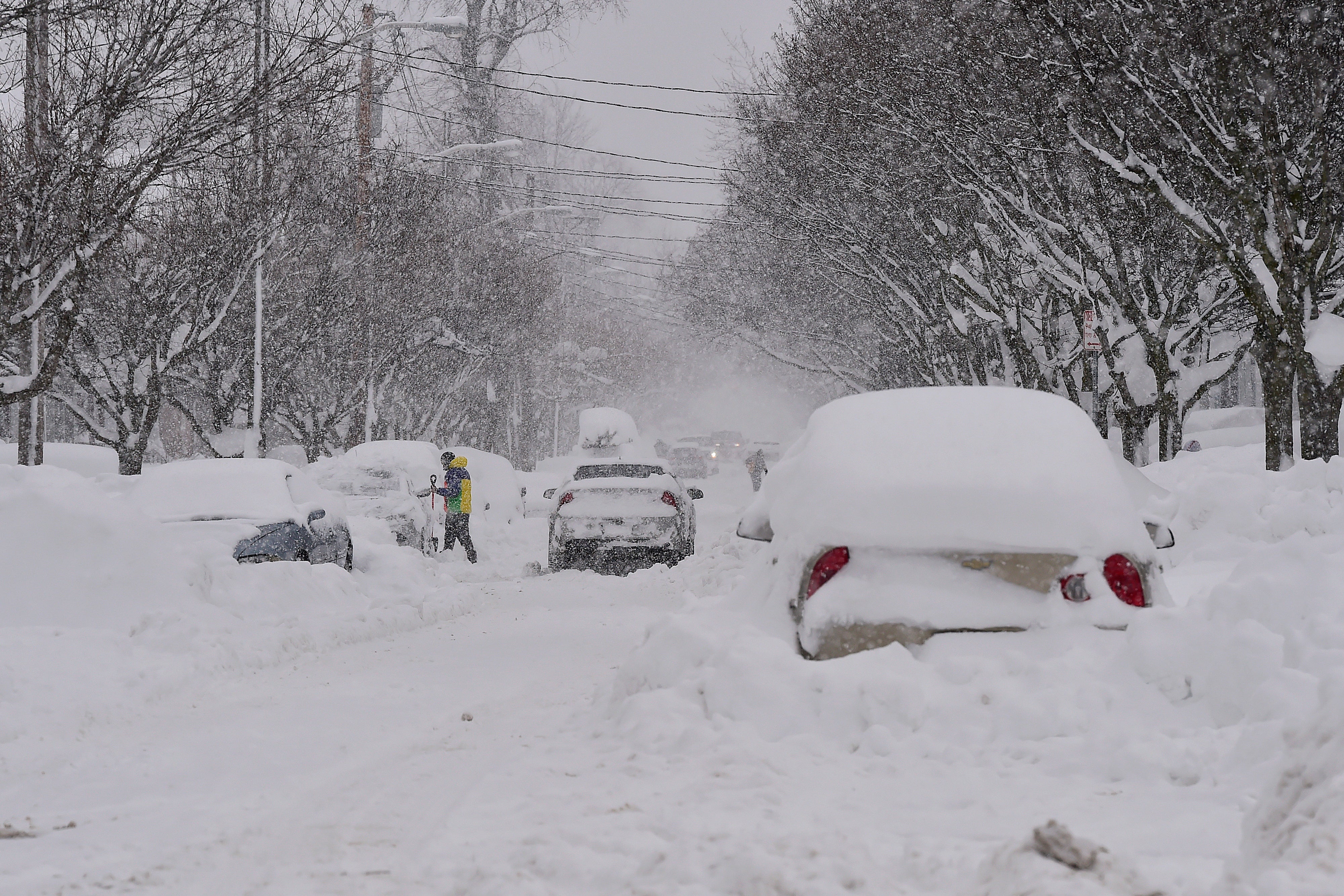Pedestrians attempt to dig out cars and clear the side streets on January 18, 2024 in Buffalo, New York.