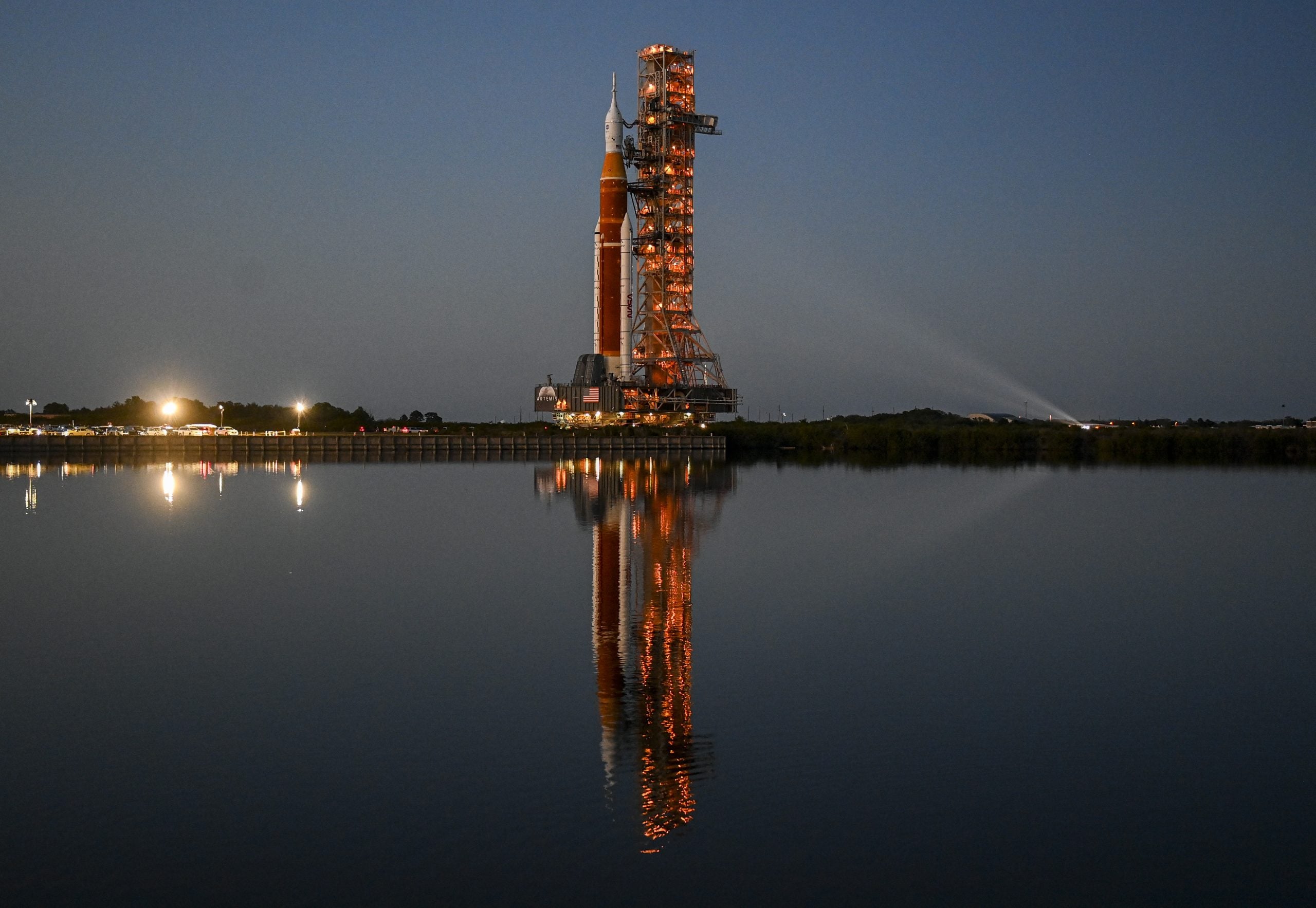 MERRITT ISLAND, FL - MARCH 17: The Artemis I Moon-bound rocket rolls out of the Vehicle Assembly Building to Launch Complex 39B for a dress rehearsal test at Kennedy Space Center.
