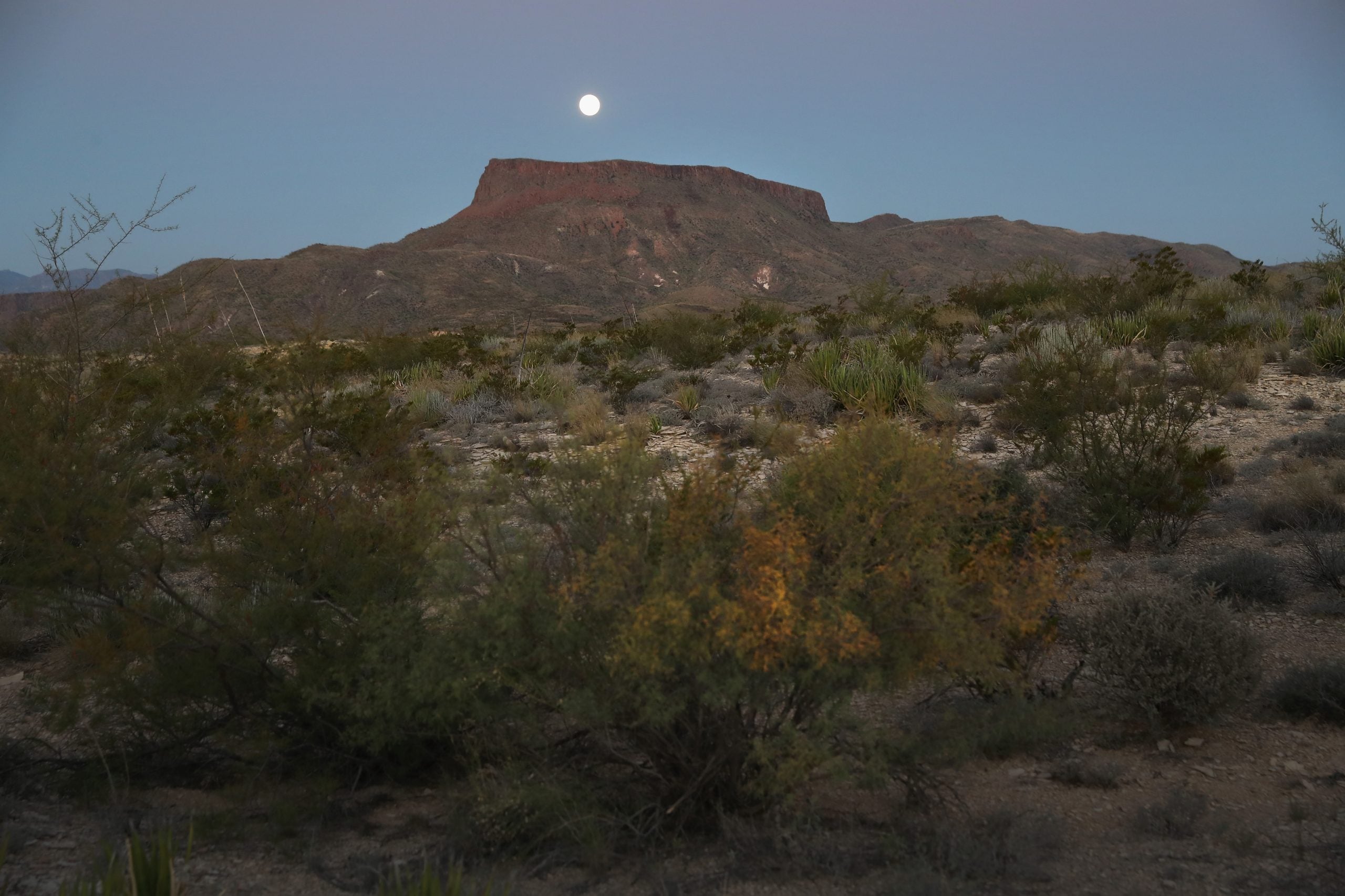 TERLINGUA, TX - OCTOBER 16: A full moon sets on October 16, 2016 in the Big Bend region of near Terlingua in west Texas.