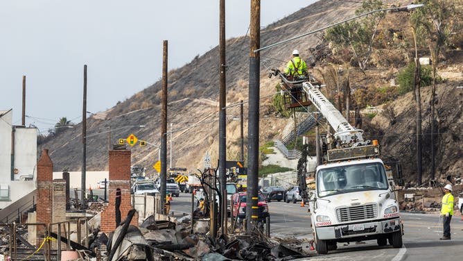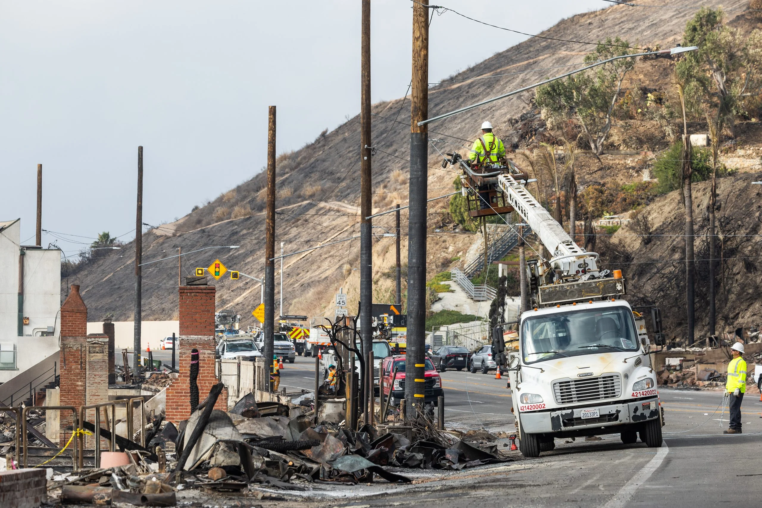 MALIBU, CA - JANUARY 25: Utility workers repair power lines on Pacific Coast Highway in Malibu, CA on Saturday, Jan. 25, 2025.