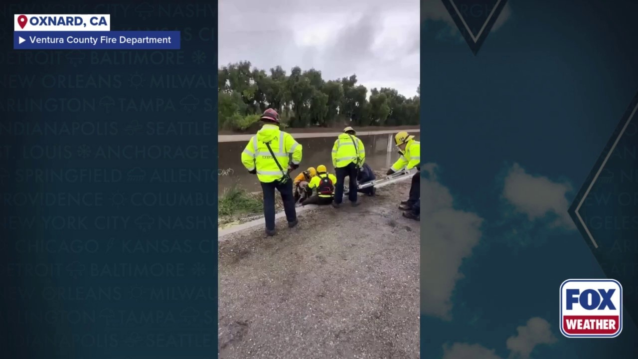 Footage of her rescue showed firefighters with the Ventura County and Oxnard fire departments using a 35-foot ladder to reach the trapped animal.