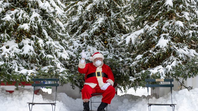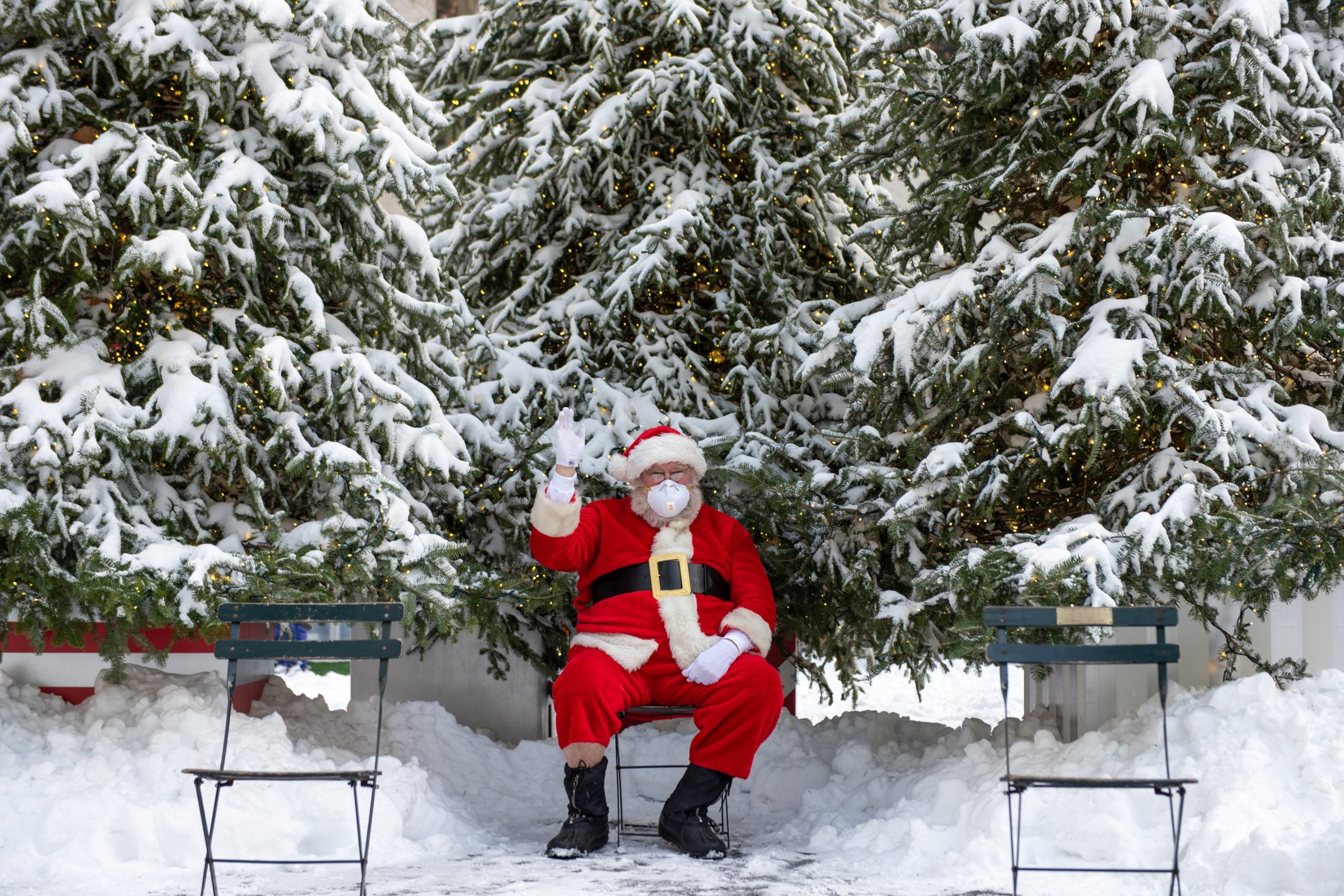 NEW YORK, NEW YORK - DECEMBER 17: Charles Nuttal, dressed as Santa Claus wearing a mask, waves while waiting for people in front of Christmas Trees covered in Snow at Bank of America Winter Village in Bryant Park on December 17, 2020 in New York City.