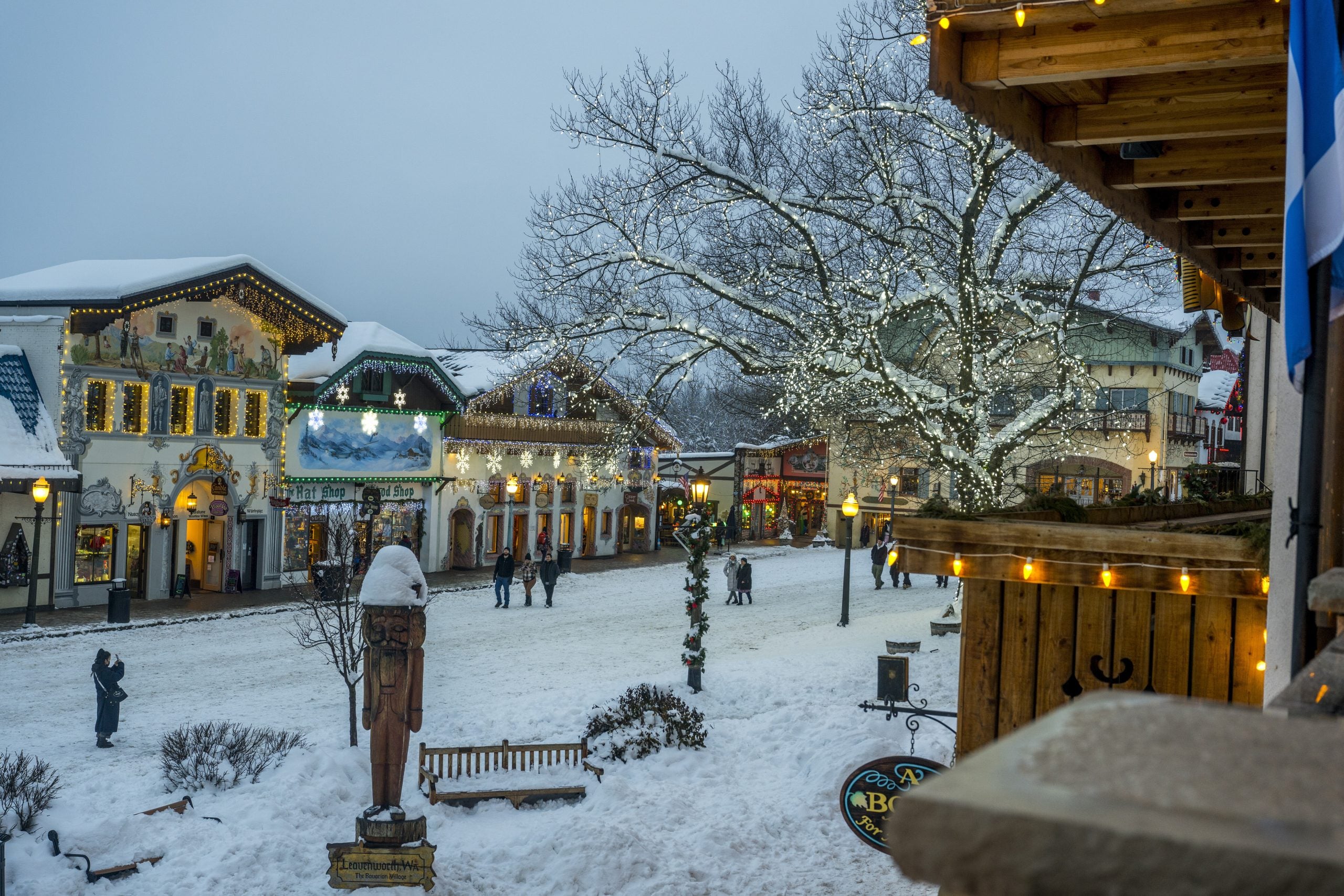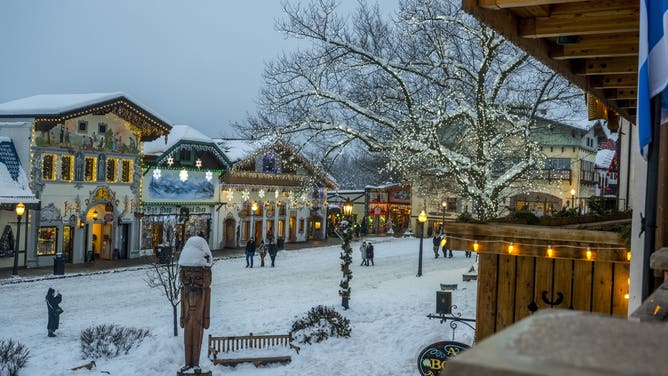 WASHINGTON, UNITED STATES - 2024/01/21: The main street decorated with Christmas lights in winter in downtown Leavenworth in Chelan County, Eastern Washington State, USA.