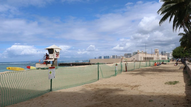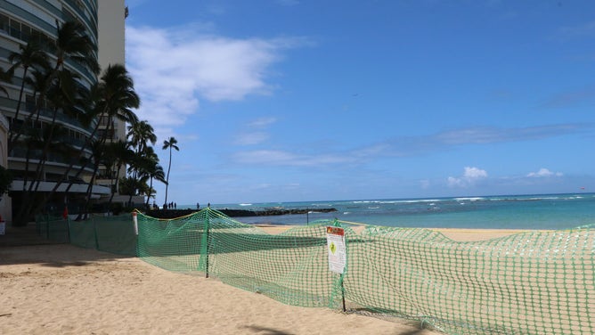 A temporary fence was put up on Kaimana Beach in Waikiki to guard off people from approaching the pair.