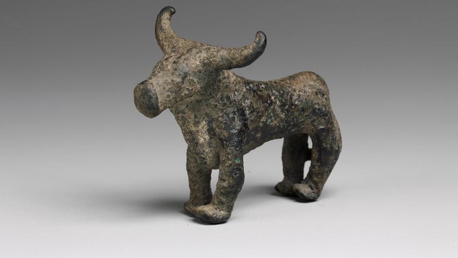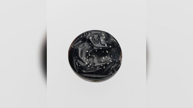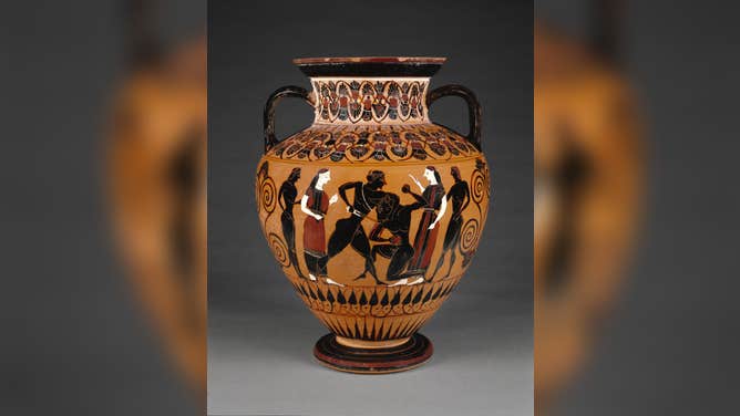 On this kylix, a type of ancient Greek pottery, a figure represents the Minotaur from the Theseus myth. Made by the Painter of London, circa 515 BC. From the National Archaeological Museum of Spain, Madrid.