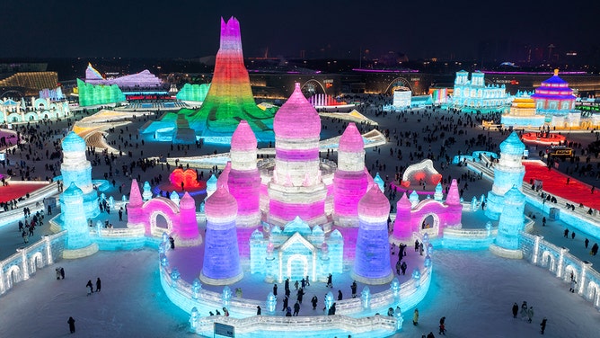 HARBIN, CHINA - DECEMBER 22: Tourists visit the 25th Harbin Ice and Snow World, one of the world's leading theme parks featuring large-scale ice and snow sculptures, on December 22, 2023 in Harbin, Heilongjiang Province of China. (Photo by Wang Zhaobo/VCG via Getty Images)