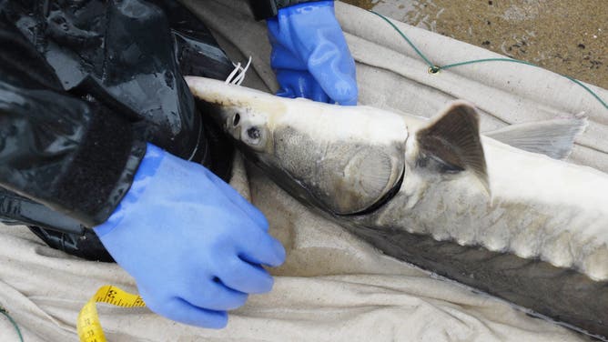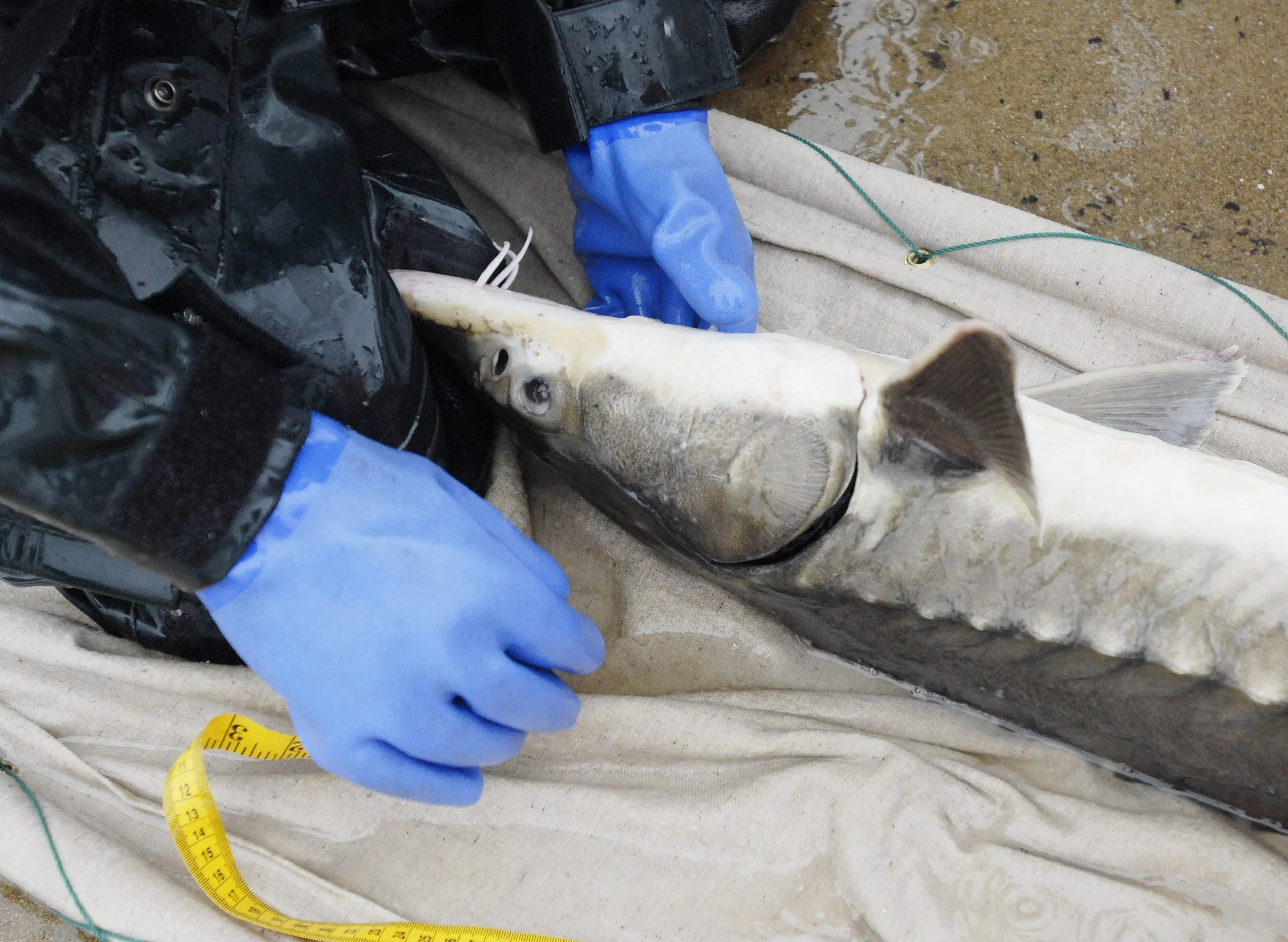 Staff photo by Shawn Patrick Ouellette: A student takes measurements for a University of New England study of an Atlantic sturgeon before releasing him into the Saco River.