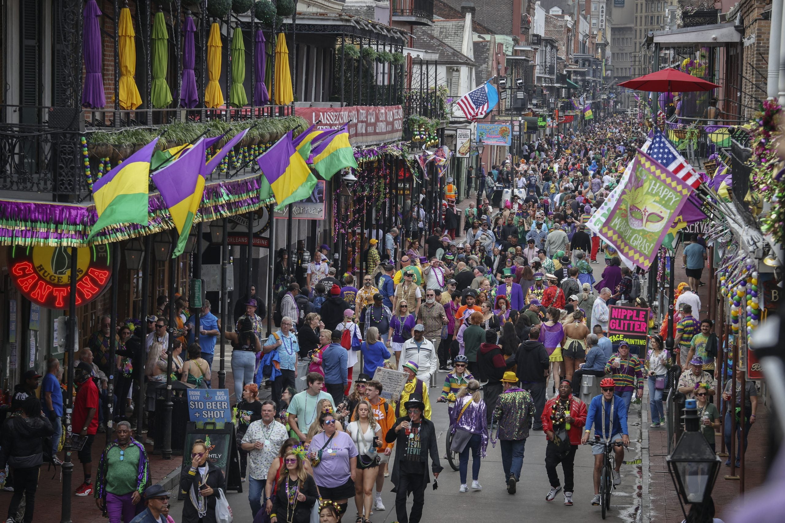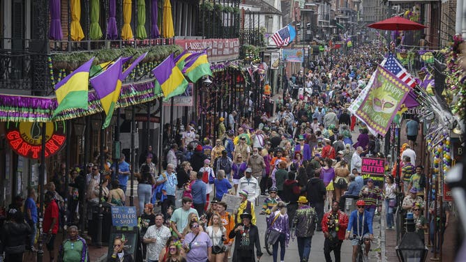 Revelers slong Bourbon Street on Mardi Gras day in New Orleans, Louisiana on March 4, 2025.