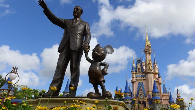 ORLANDO, FL - APRIL 3: A statue of Walt Disney and Mickey Mouse stands in a garden in front of Cinderella's Castle at the Magic Kingdom Park at Walt Disney World on April 3, 2025, in Orlando, Florida.