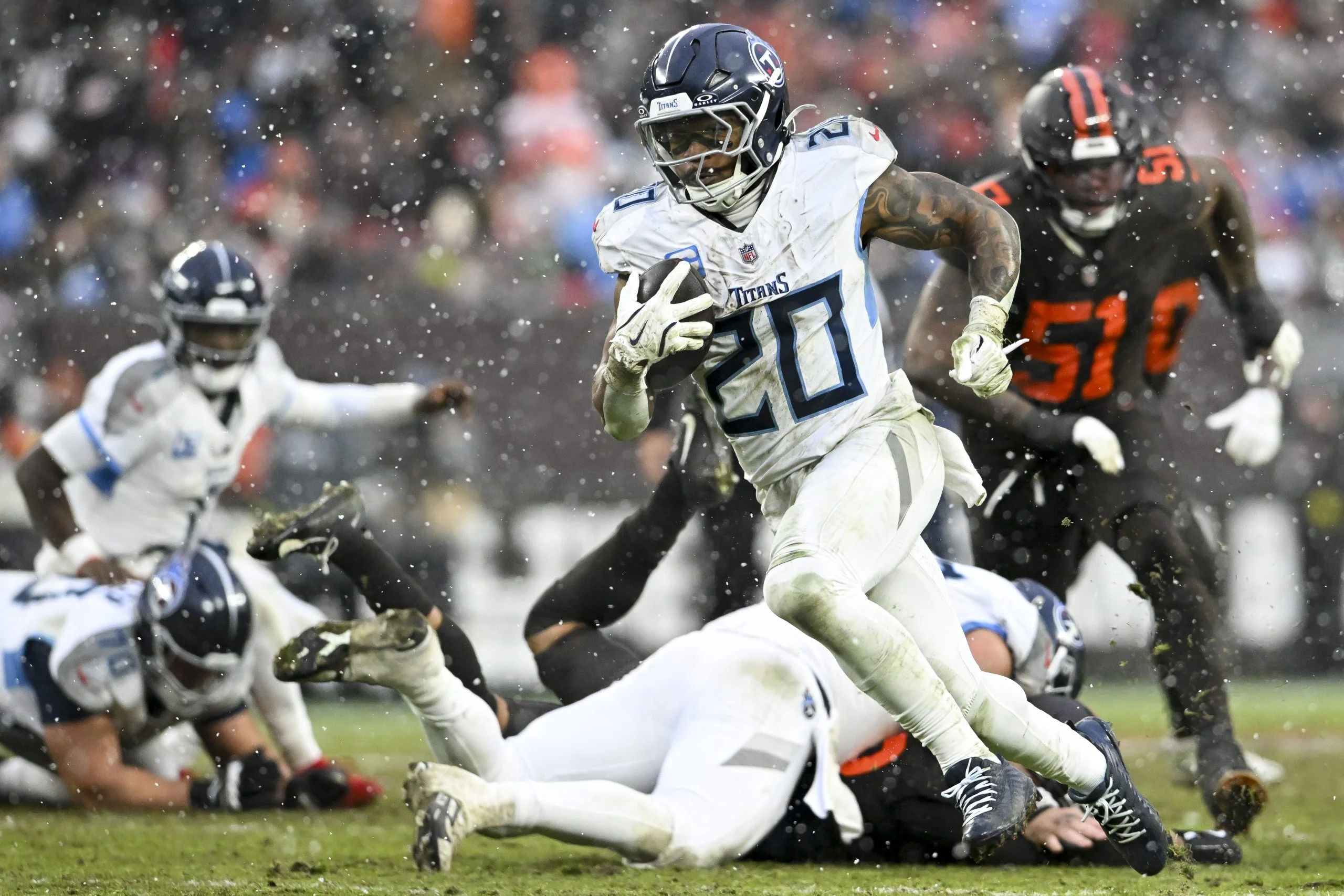 CLEVELAND, OHIO - DECEMBER 07: Tony Pollard #20 of the Tennessee Titans runs for a touchdown during the third quarter against the Cleveland Browns at Huntington Bank Field on December 07, 2025 in Cleveland, Ohio.