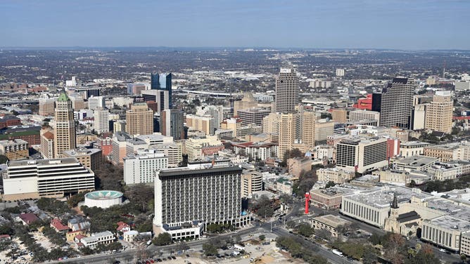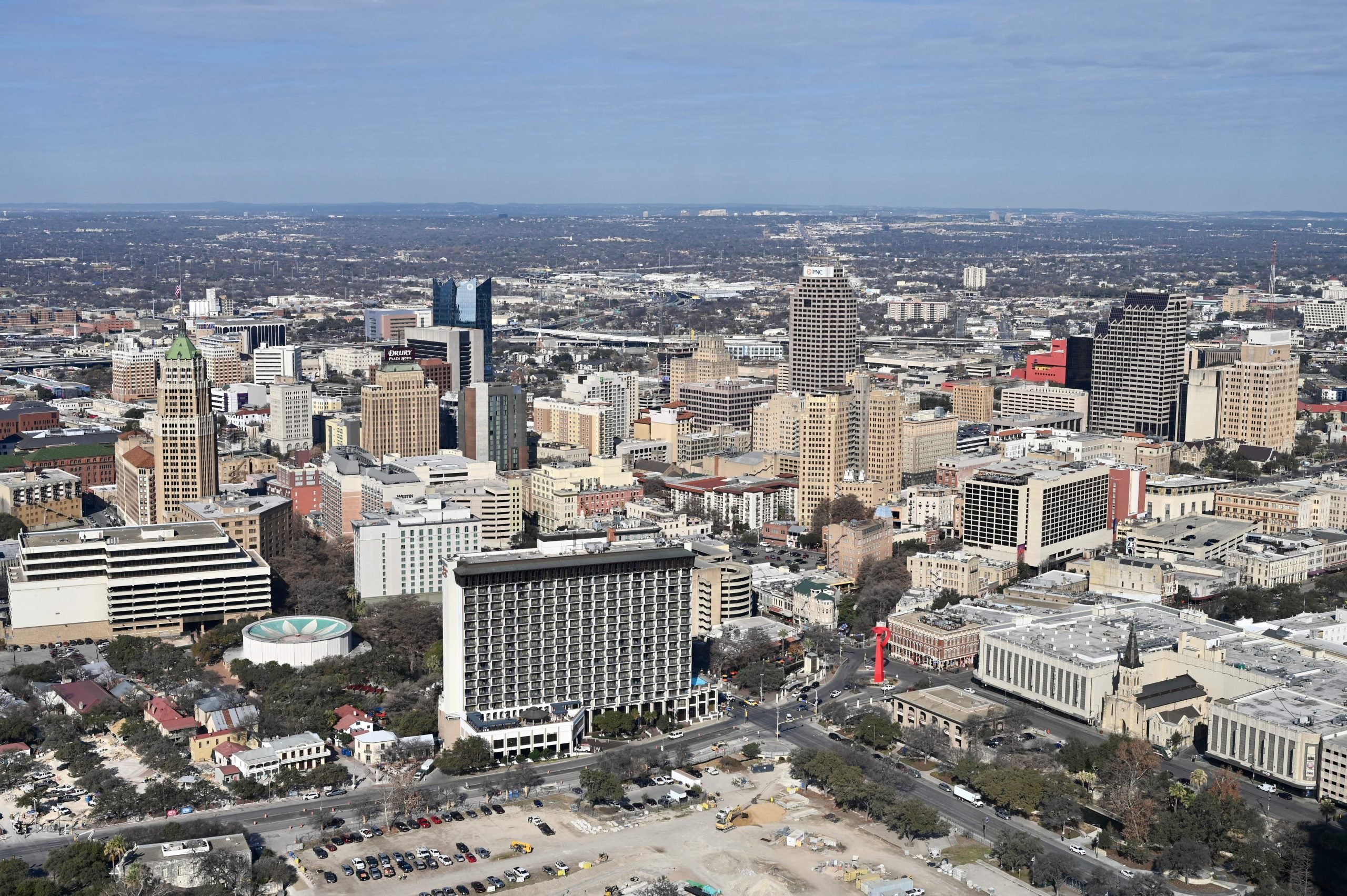 Downtown San Antonio, Texas, is pictured from the Tower of the Americas, on January 23, 2023.