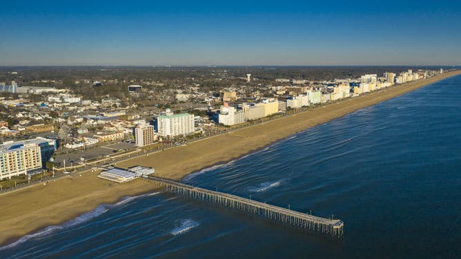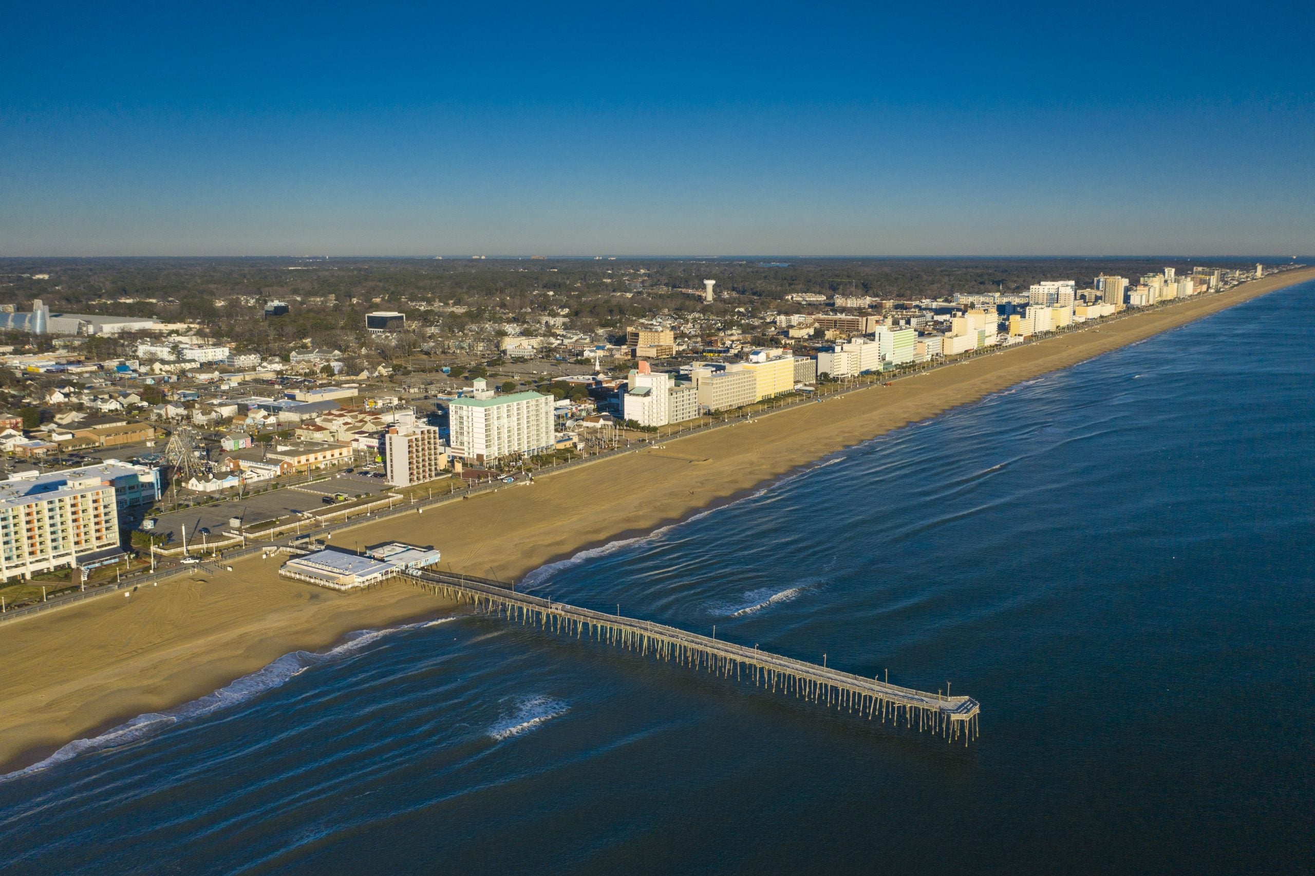 Aerial drone view of Virginia Beach Skyline and Fishing Pier with Atlantic Ocean, Virginia City, Virginia.