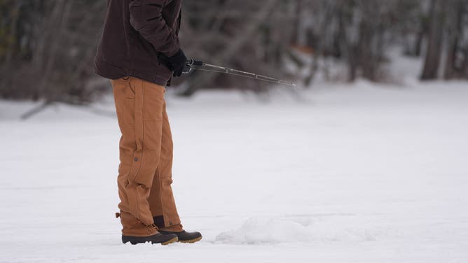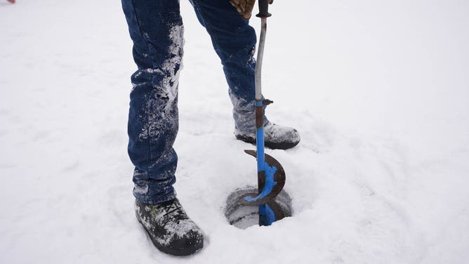 A man ice fish during the Grafton Lakes State Park annual Ice Fishing Contest in Cropseyville, New York.