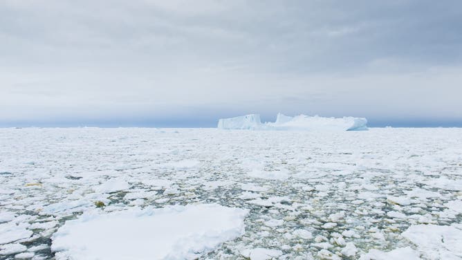 A giant iceberg floats amidst a sea of pack ice in the French Passage, off the coast of Antarctica. Antarctica.