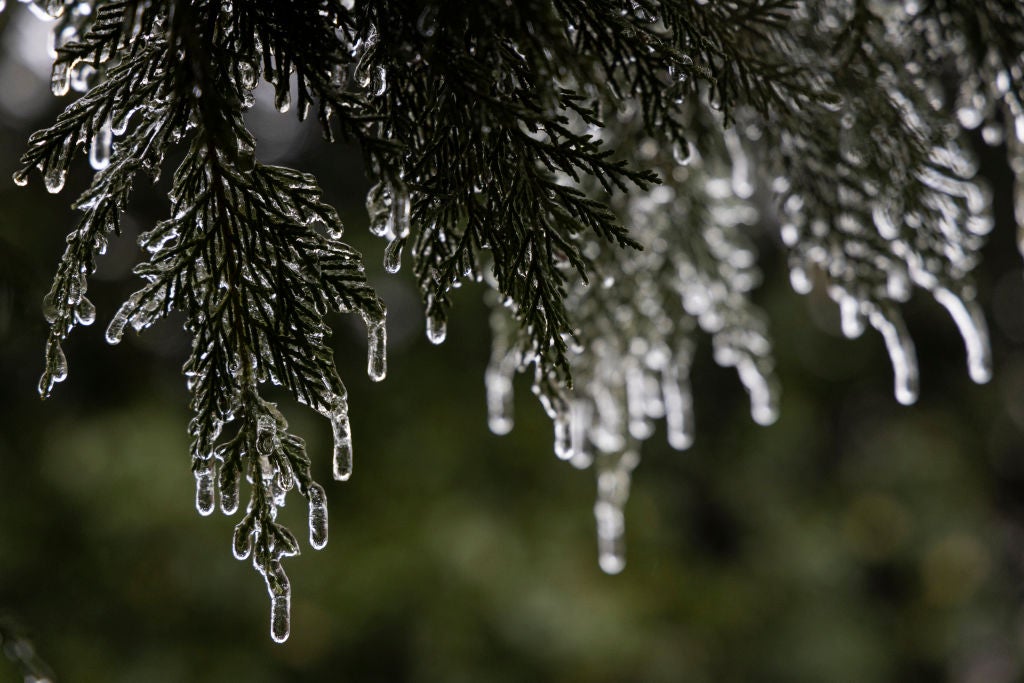 Freezing rain happens when raindrops fall to the surface where temperatures are below freezing. This occurs thanks to a layer of warm air aloft in the atmosphere. Snowflakes falling from the clouds melt into raindrops when they reach this warm layer of air. Those raindrops then fall to the ground, but freeze instantly due to a layer of sub-freezing air near the surface.