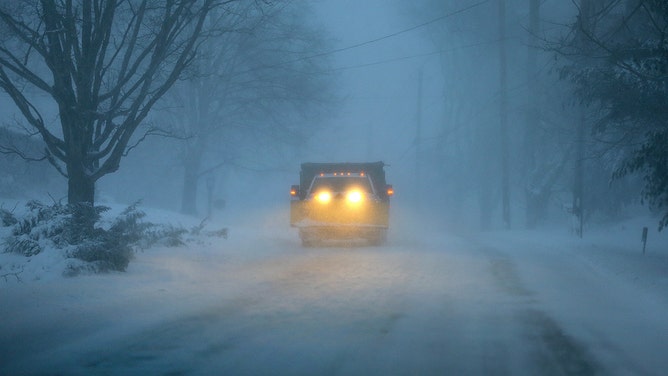 A truck slowly makes its way along River Street in the early morning with whiteout conditions from the blizzard in Norwell, Massasschuttes, on Jan. 29, 2022.