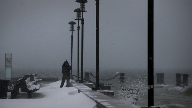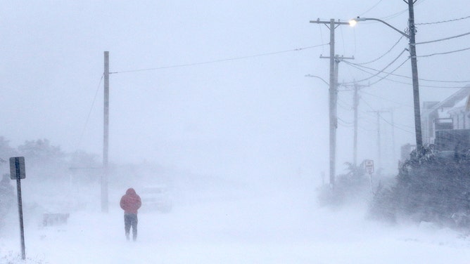 A man walks along Surf Drive in whiteout conditions during the snowstorm in Falmouth, Massasschuttes, on Jan. 29, 2022.