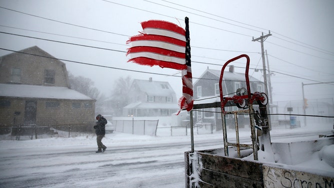 A wind-swept flag is seen in Hull, Massasschuttes, as a winter storm shows its fury on Jan. 29, 2022. A large storm bears down on New England, bringing one to two feet of snow, along with high winds, cold temperatures in the largest nor'easter in recent years.