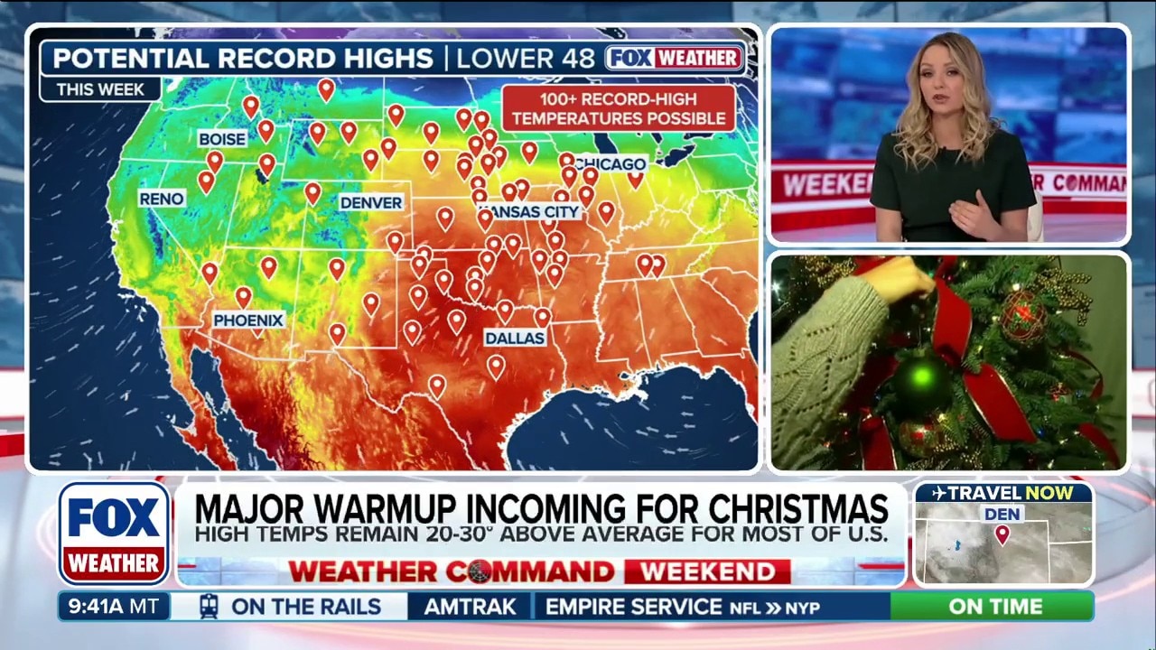 According to the FOX Forecast Center, throughout this holiday week, more than 100 record highs will be challenged, including at least six that are over 100 years old for Christmas. The warm weather pattern will continue after the holiday, too, with the core of the warmth centered over the Central U.S. still.