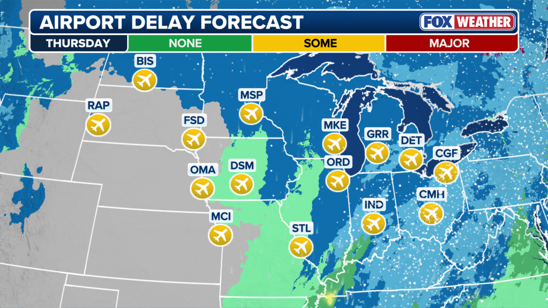 Southern Missouri, Arkansas and the Tennessee Valley will all see rain by Thursday evening, as the storm could cause delays across a swath of airports across the central U.S.