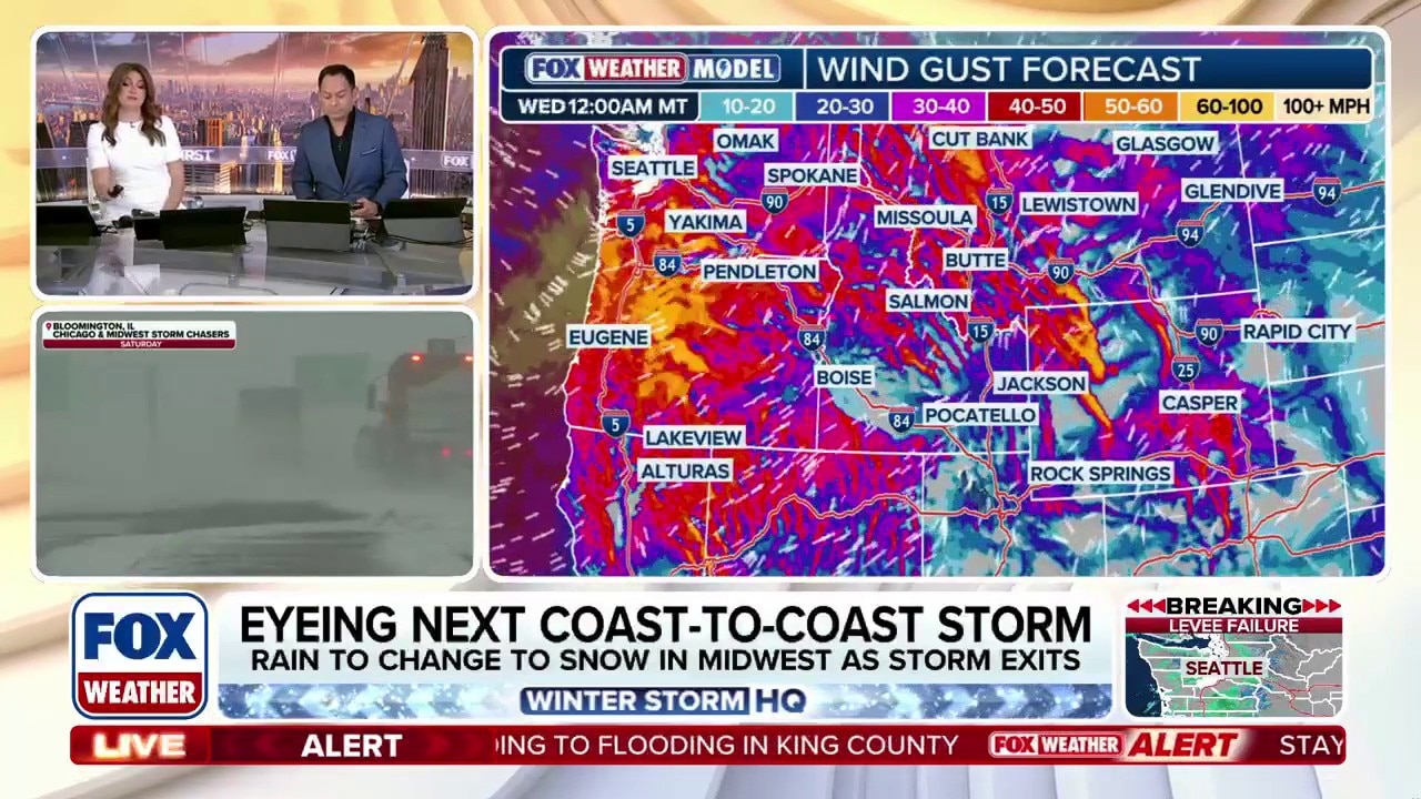 This powerful storm is set to move out of the Pacific Northwest, where heavy rains have exacerbated last week's historic flooding in Washington, into the Northern Plains and Northern Rockies beginning Wednesday, bringing wind gusts of 50-70 mph. From there it will deliver mostly rain and some snow as it tracks east across the country through the end of the workweek.